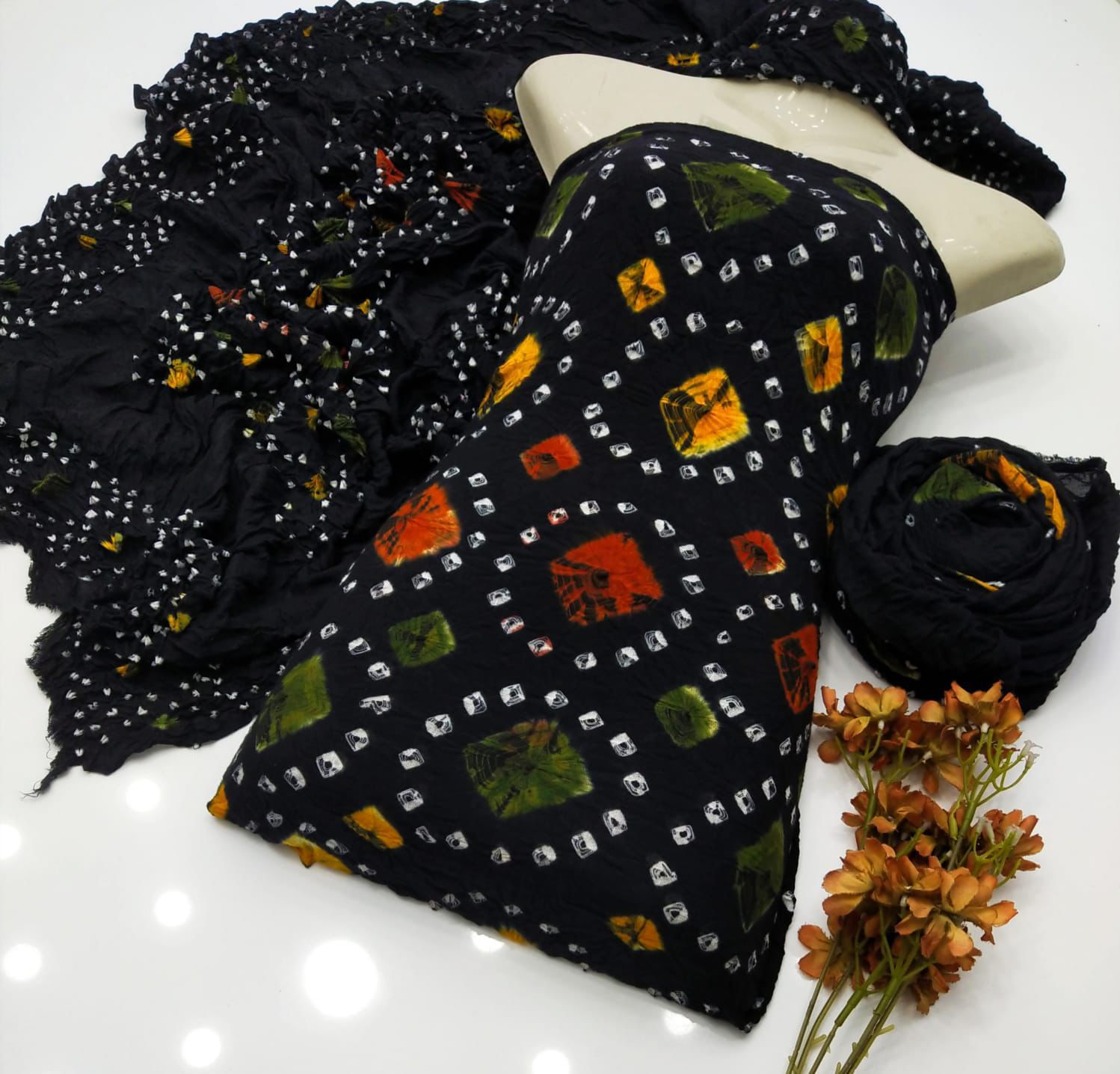 "Alhamdulillah, introducing our stunning new summer collection! This beautiful 4-piece suit features handmade Chunri design on premium Soft Arabic Linen 60/60 fabric. The full-size shirt, dupatta, and trouser are paired with separate sleeves, all crafted with 8-meter cutting. A true masterpiece of elegance and craftsmanship.