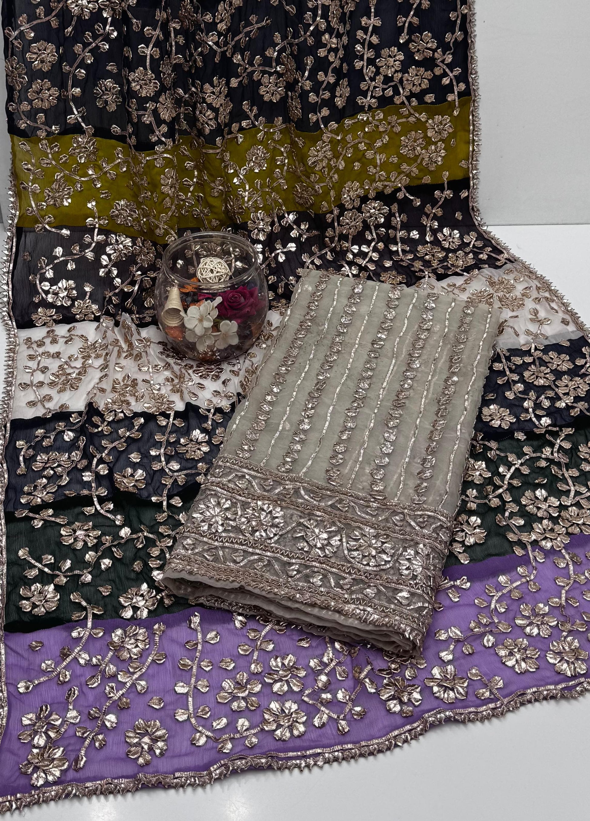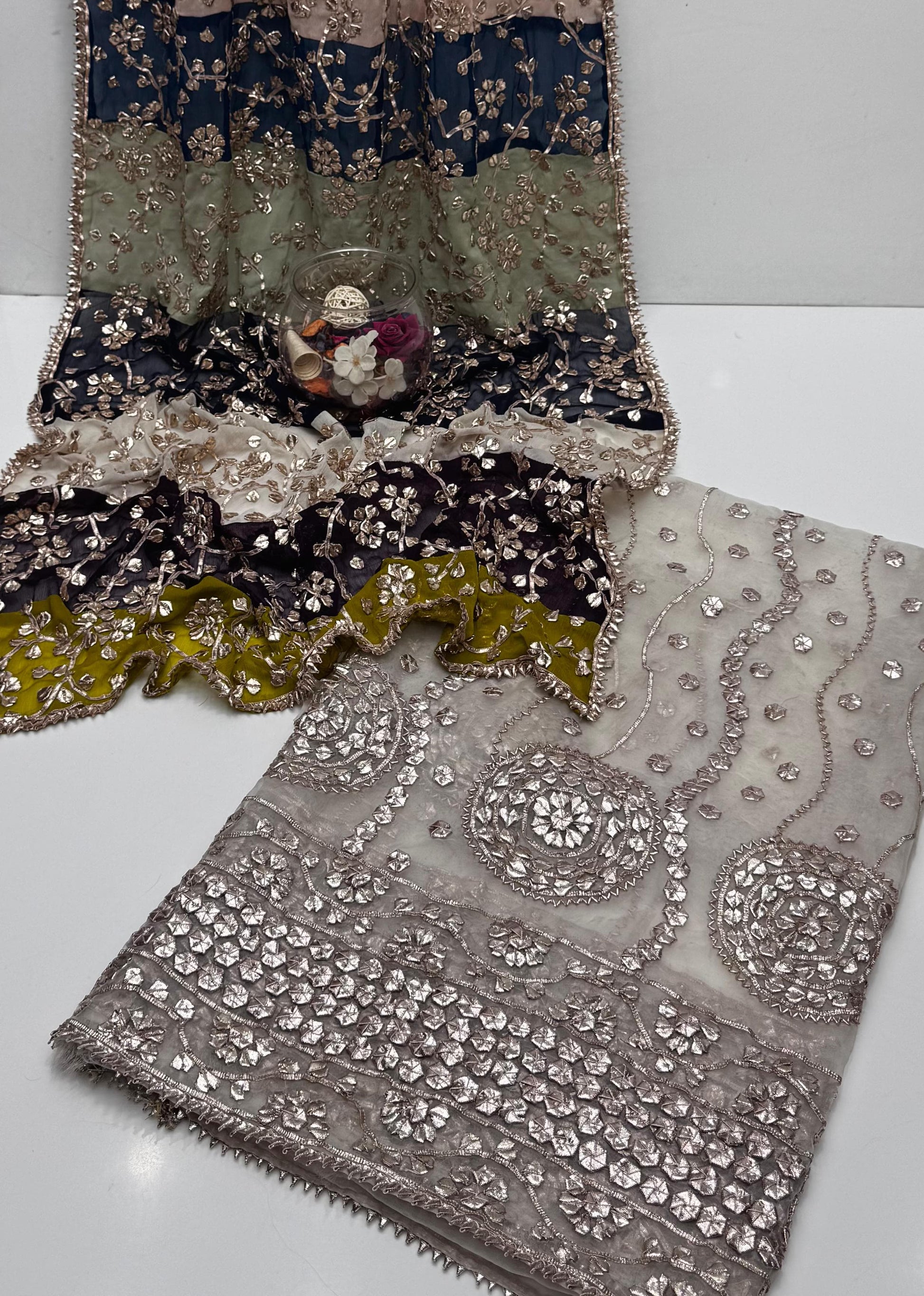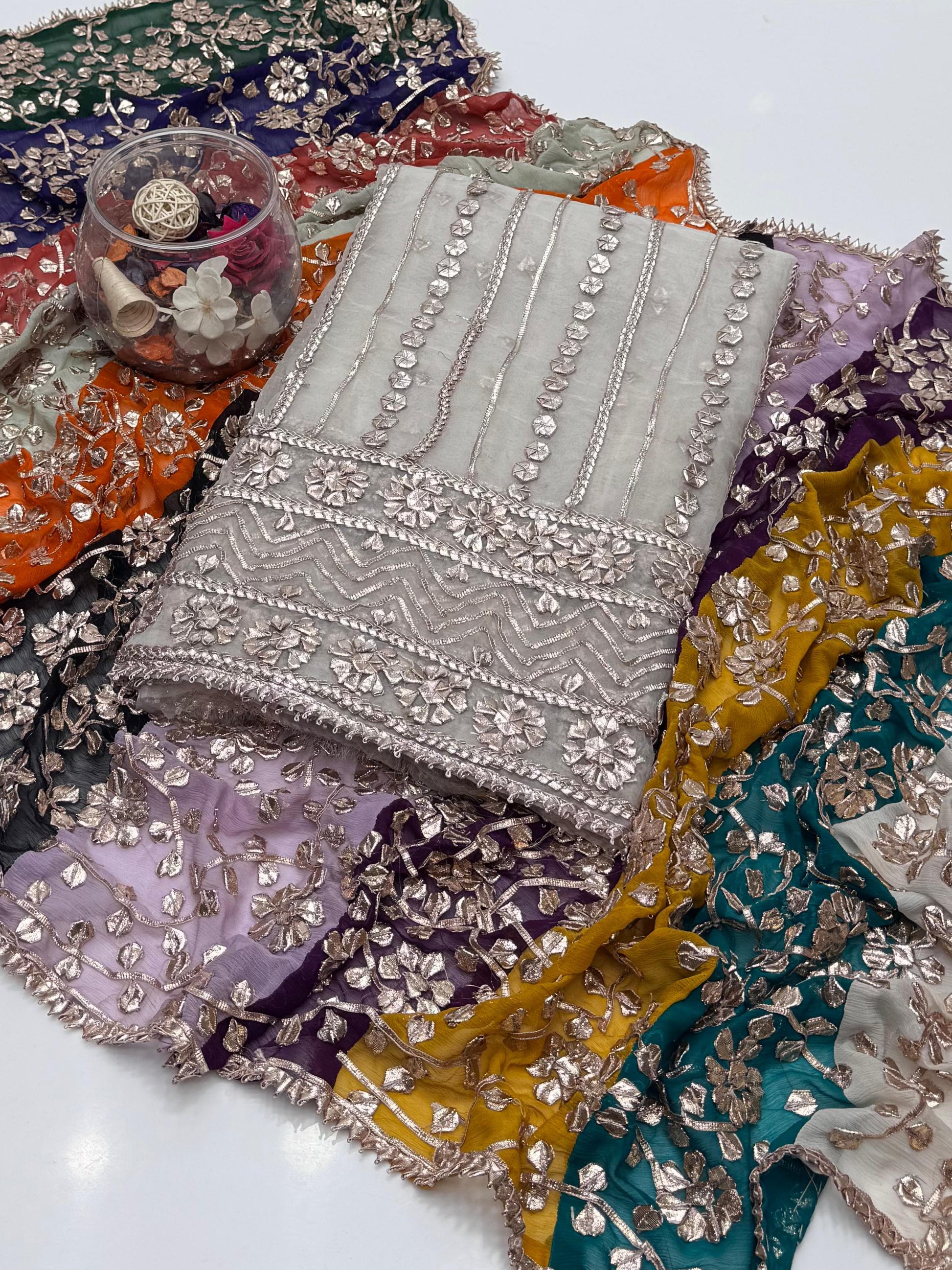 Experience the luxury of Pure Organza with our stunning 2-piece dress, featuring a shirt adorned with exquisite handmade Gotta work. The shirt is dyeable, allowing you to customize the color to your preference. Paired with a beautifully designed Chiffon multi dupatta with intricate Gotta work, this ensemble is perfect for special occasions and formal events.
