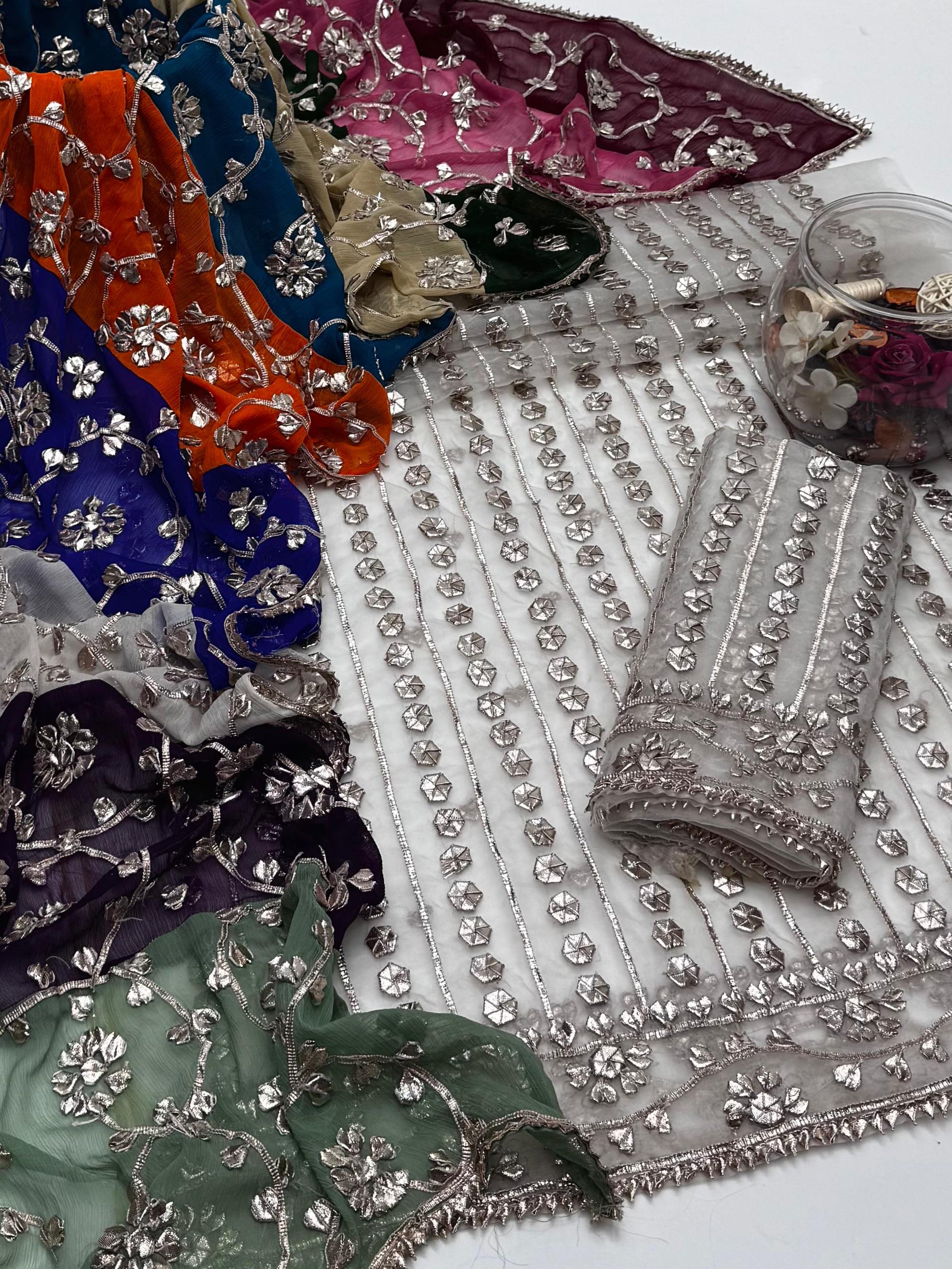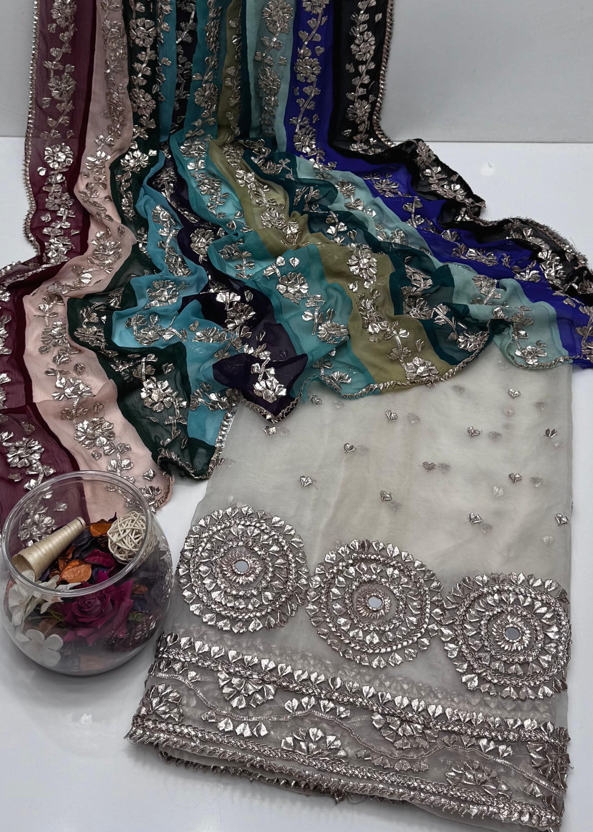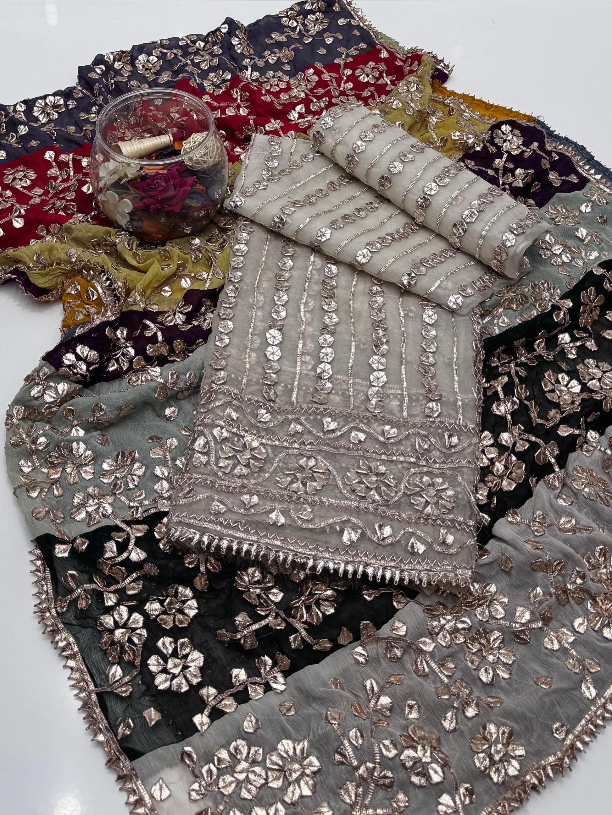 Experience the luxury of Pure Organza with our stunning 2-piece dress, featuring a shirt adorned with exquisite handmade Gotta work. The shirt is dyeable, allowing you to customize the color to your preference. Paired with a beautifully designed Chiffon multi dupatta with intricate Gotta work, this ensemble is perfect for special occasions and formal events.