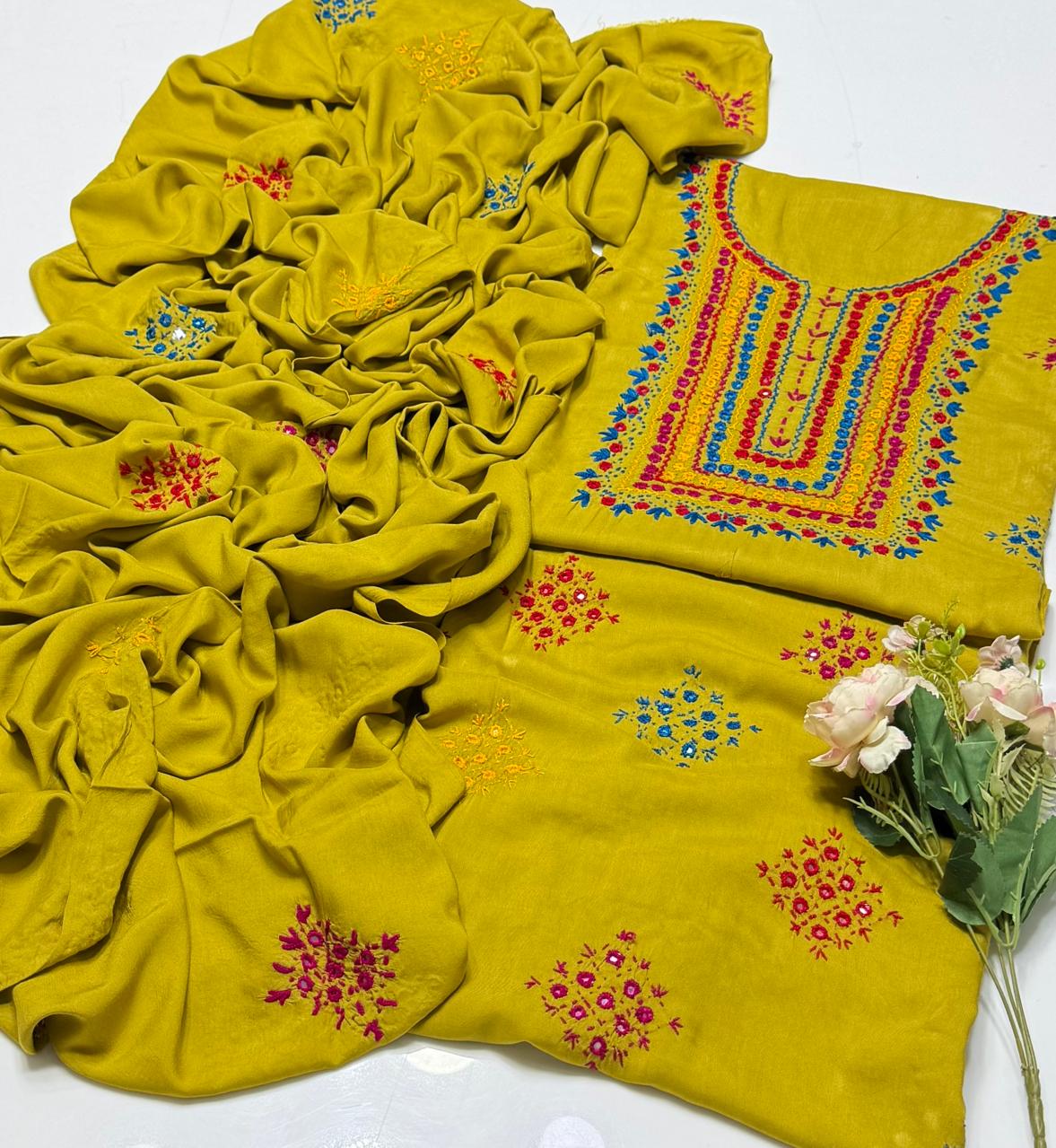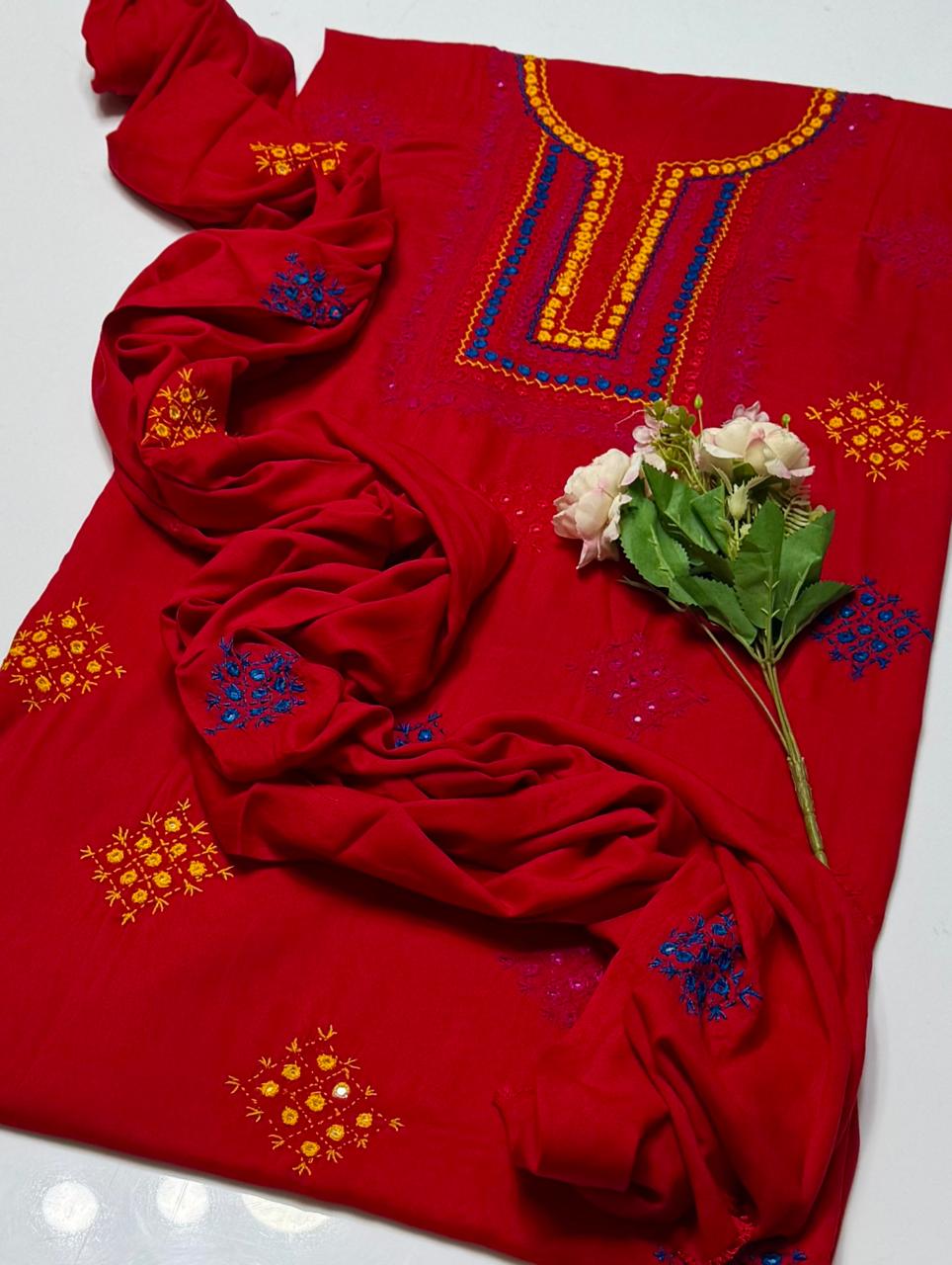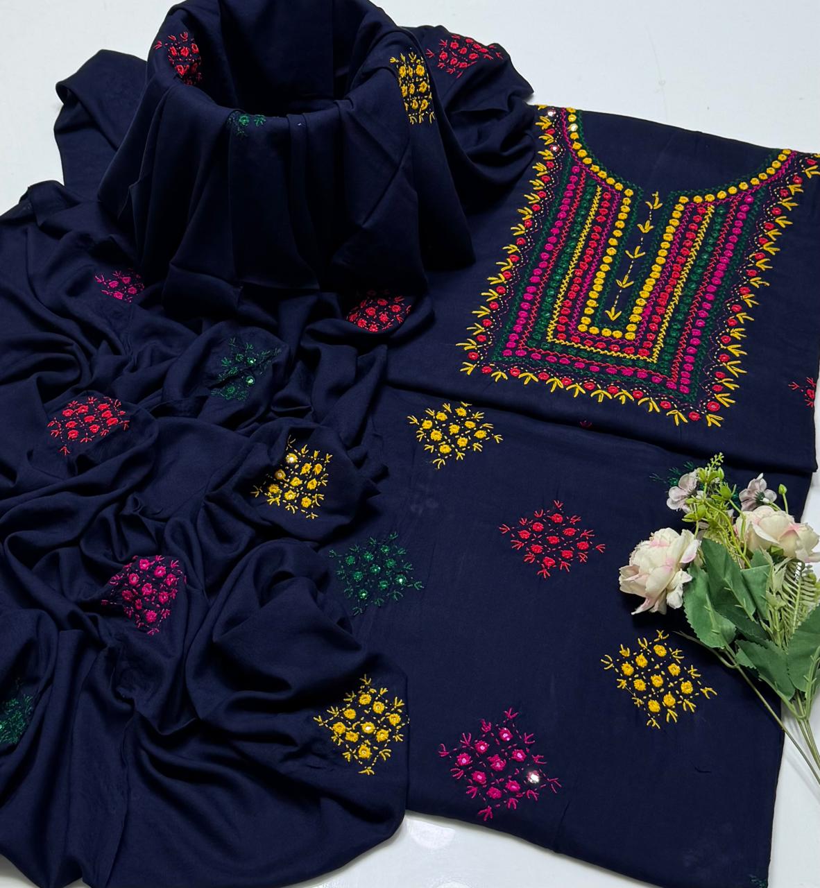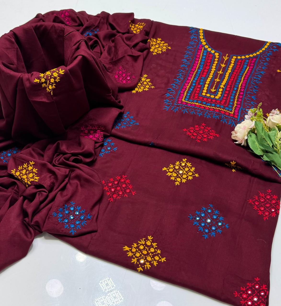 "Wrap yourself in elegance this winter with our stunning 3-piece dress! Made from premium Classic Linen, the shirt features intricate handmade Shisha gala boti jall embroidery, paired with an attached trouser and a gorgeous dupatta adorned with embroidery boti bunch. The plain sleeves add a touch of simplicity to this exquisite outfit.