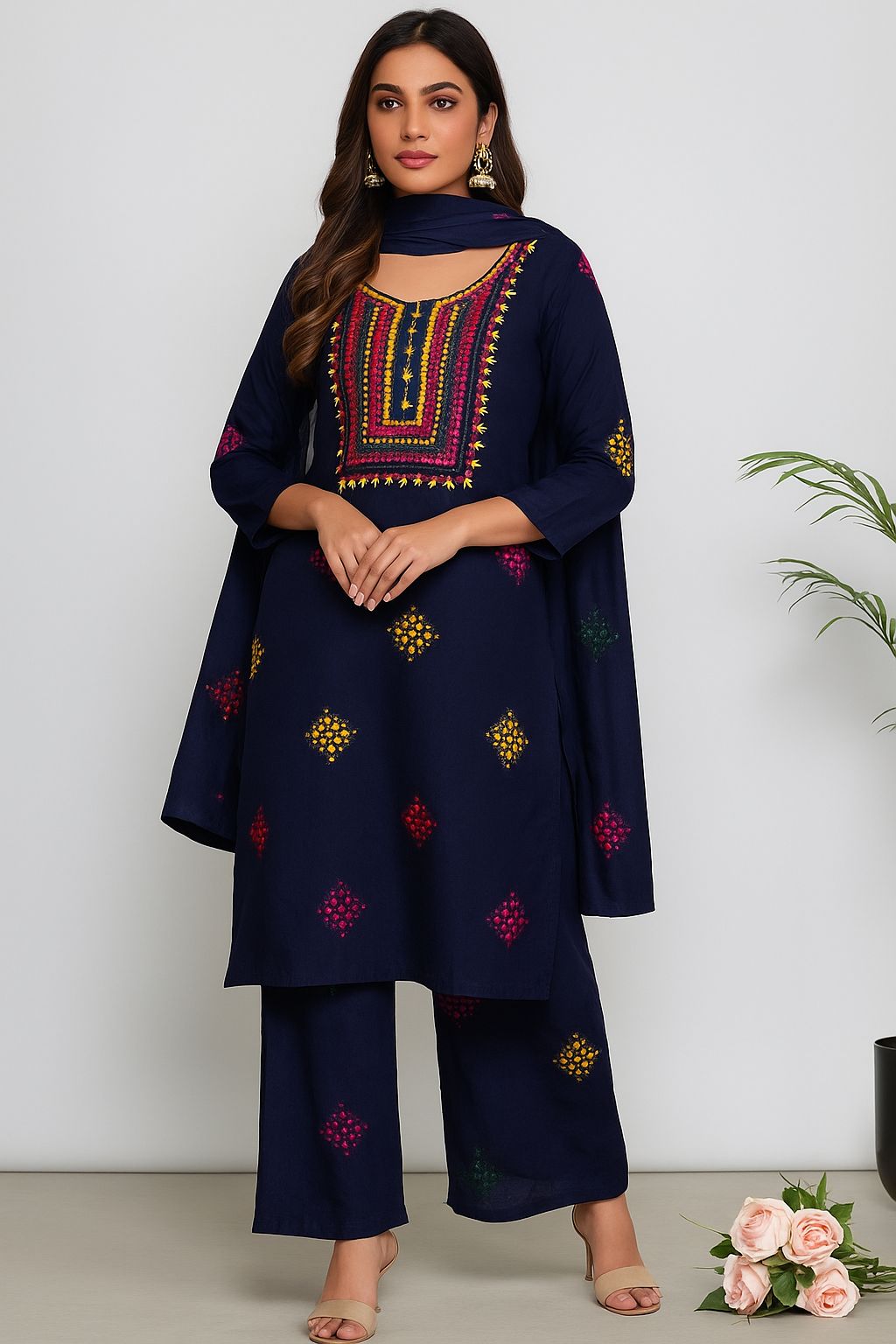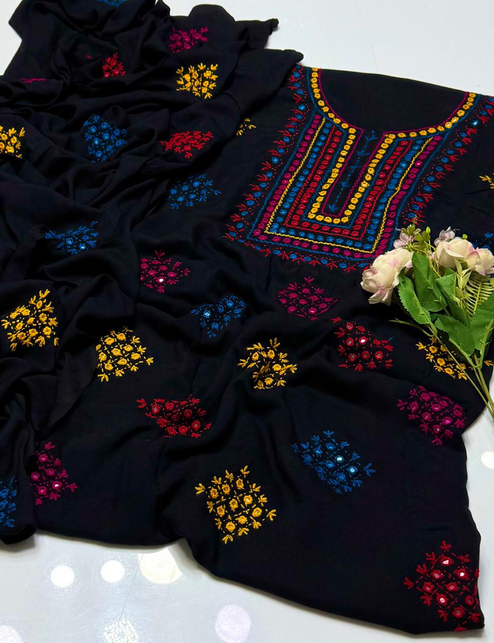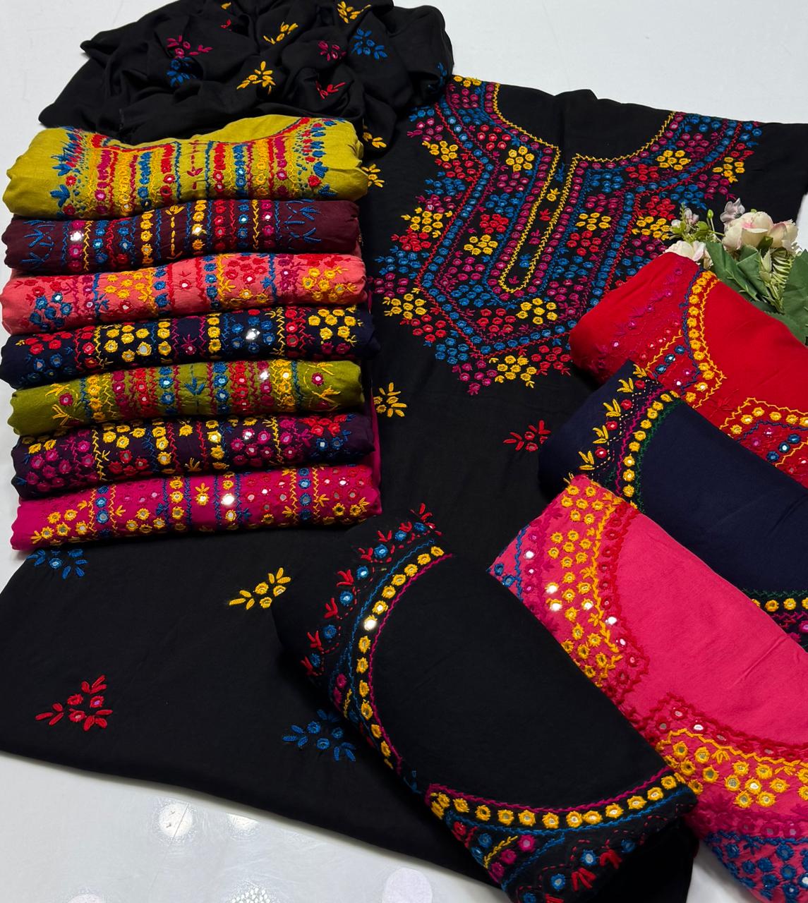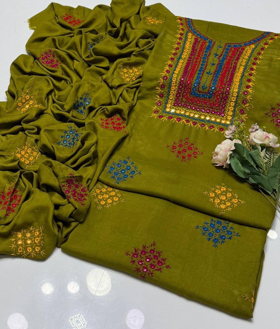 "Wrap yourself in elegance this winter with our stunning 3-piece dress! Made from premium Classic Linen, the shirt features intricate handmade Shisha gala boti jall embroidery, paired with an attached trouser and a gorgeous dupatta adorned with embroidery boti bunch. The plain sleeves add a touch of simplicity to this exquisite outfit.