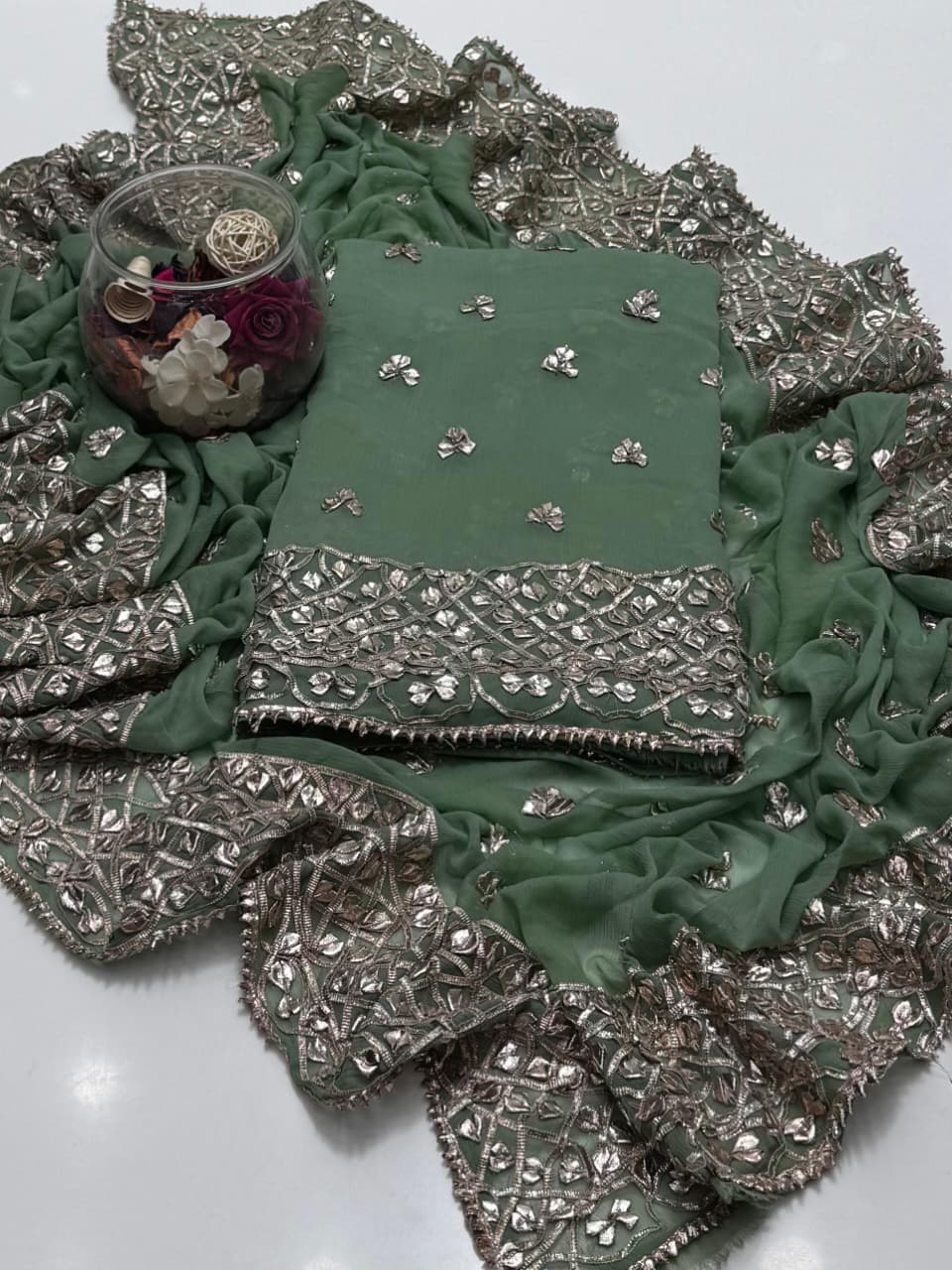 Add a touch of traditional elegance with our Bamber Chiffon 2-piece dress! The shirt boasts a beautiful Handmade Gota Daman style, paired with a matching Bamber Chiffon Gotta dupatta. Perfect for formal gatherings and festive occasions in Pakistan.