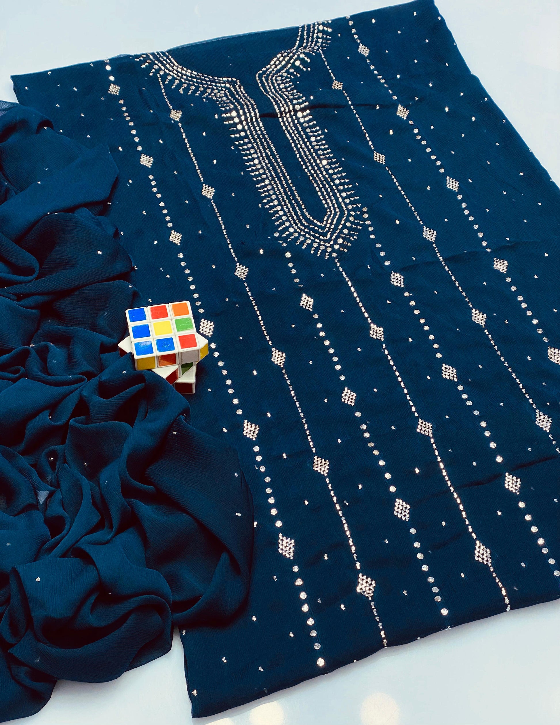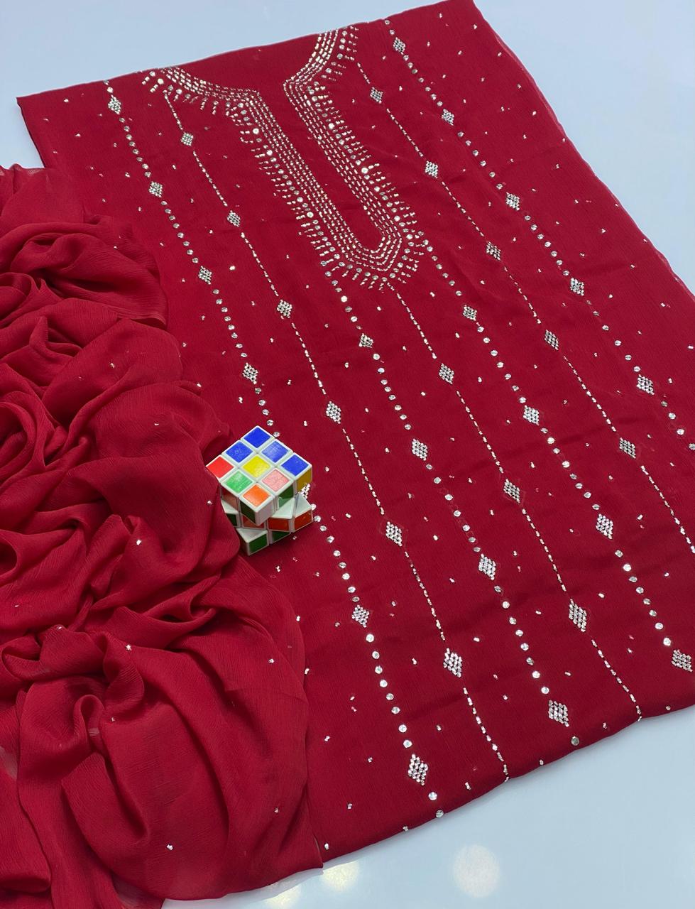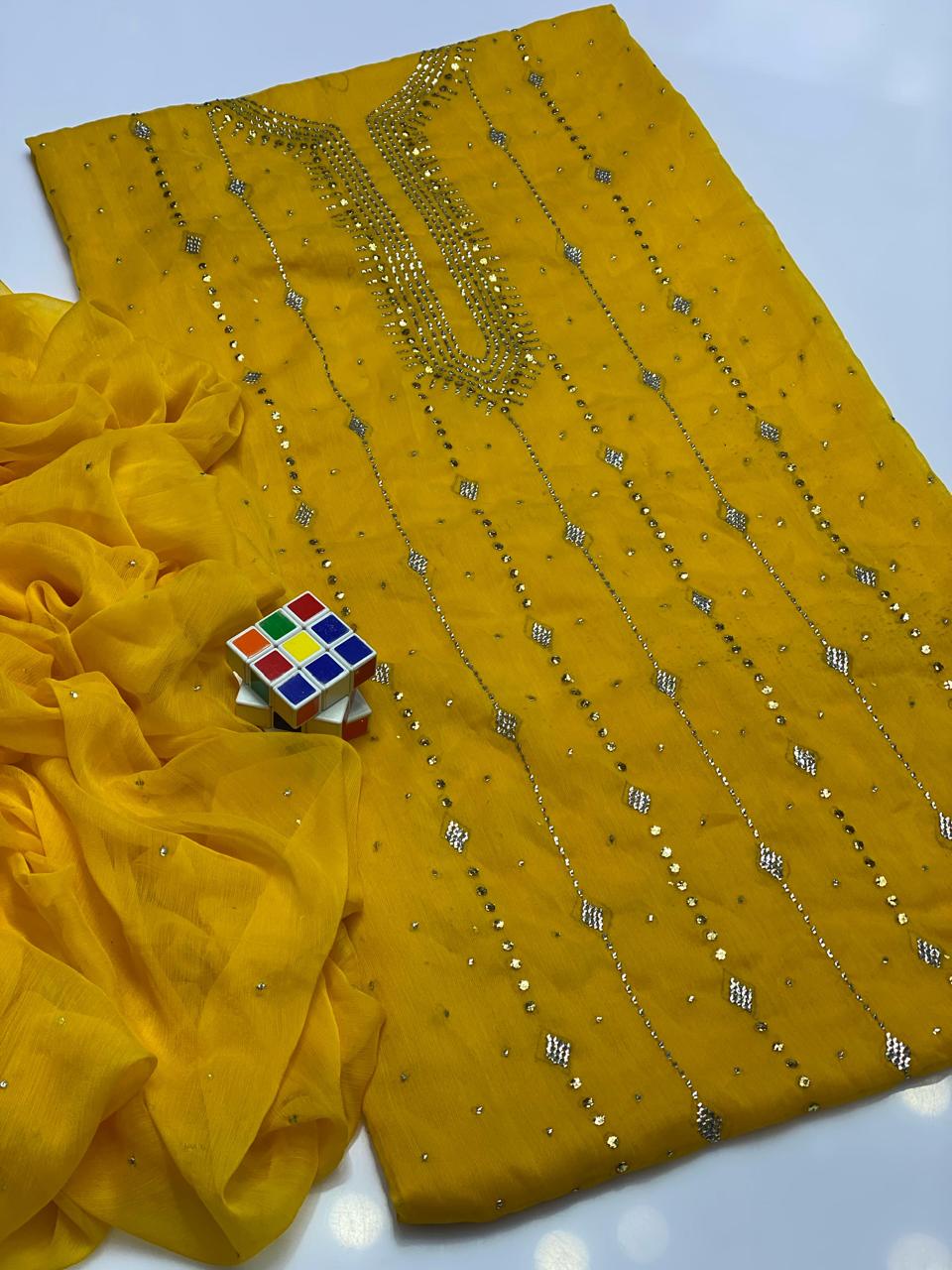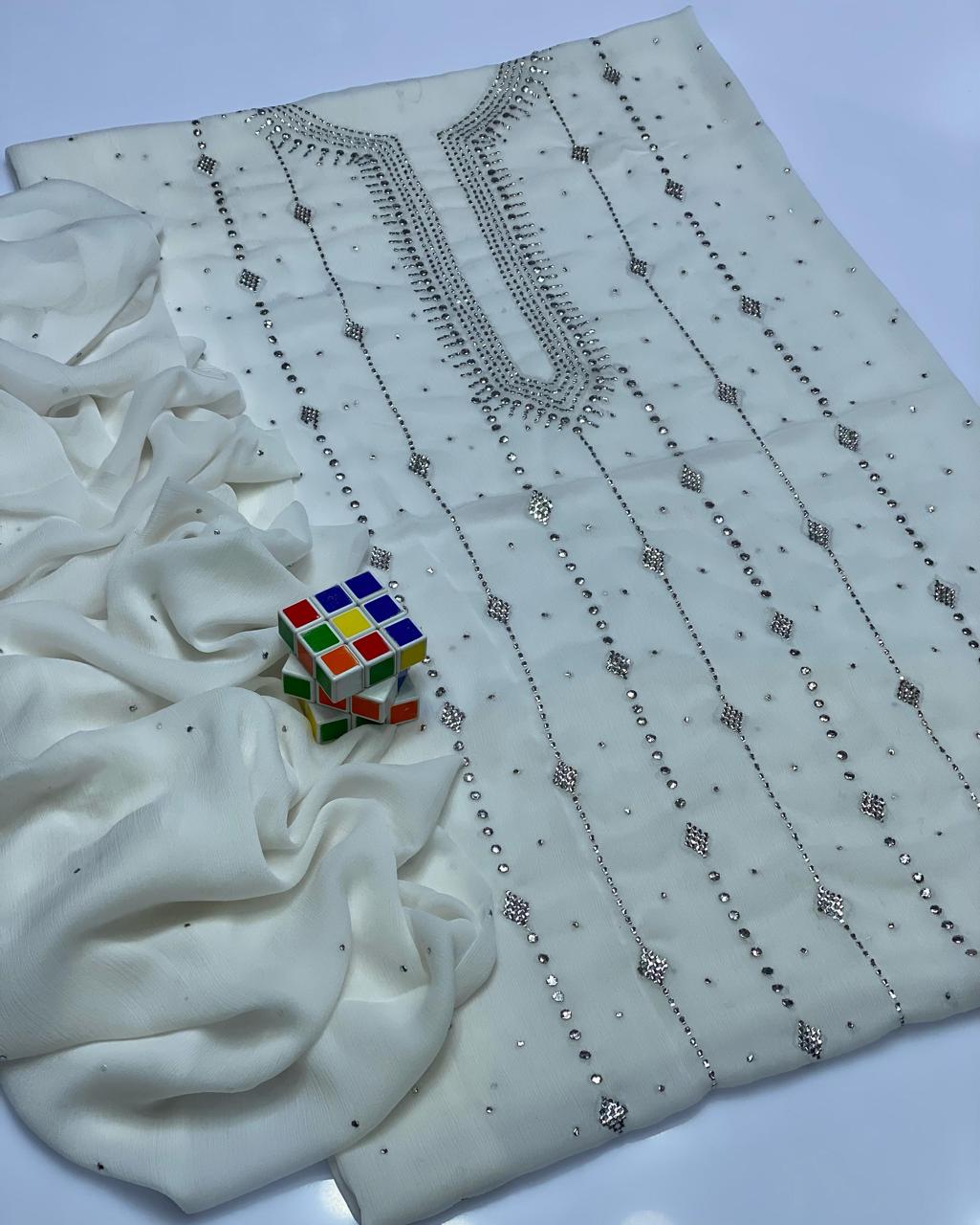 _ALHAMDULILAH_, introducing our stunning 2-piece dress! Made from Soft Bamber Chiffon, the shirt features intricate Mukaish Kamdani work in a beautiful Barfi design, with heavy work on the gala and sleeves. Paired with a gorgeous Bamber Chiffon dupatta adorned with Mukaish Kamdani work, this outfit is a true masterpiece.