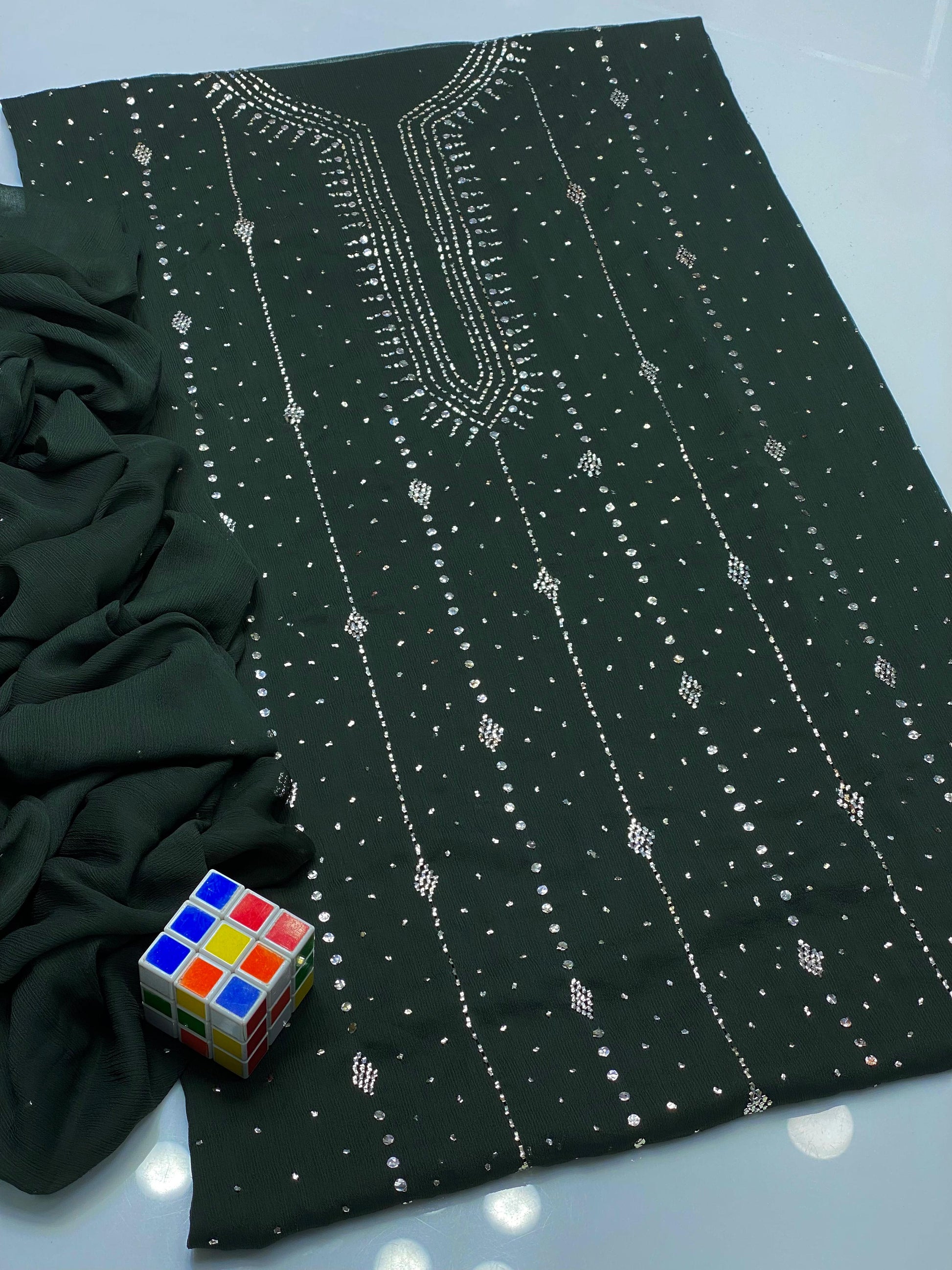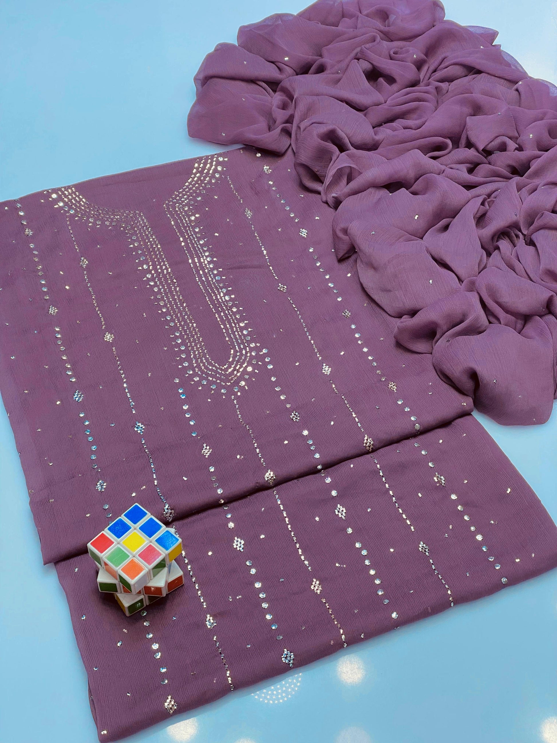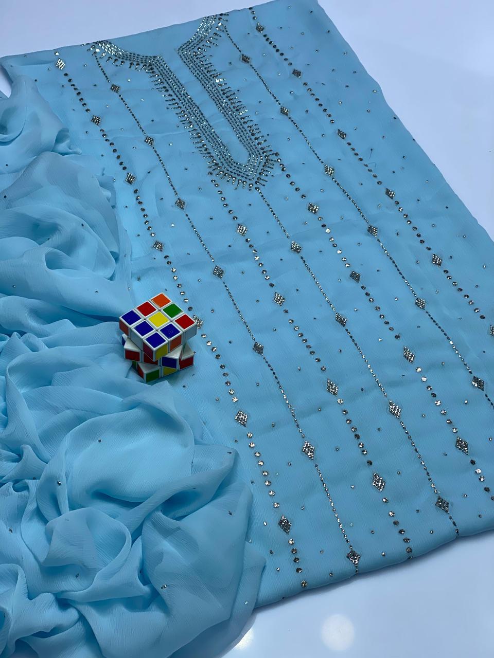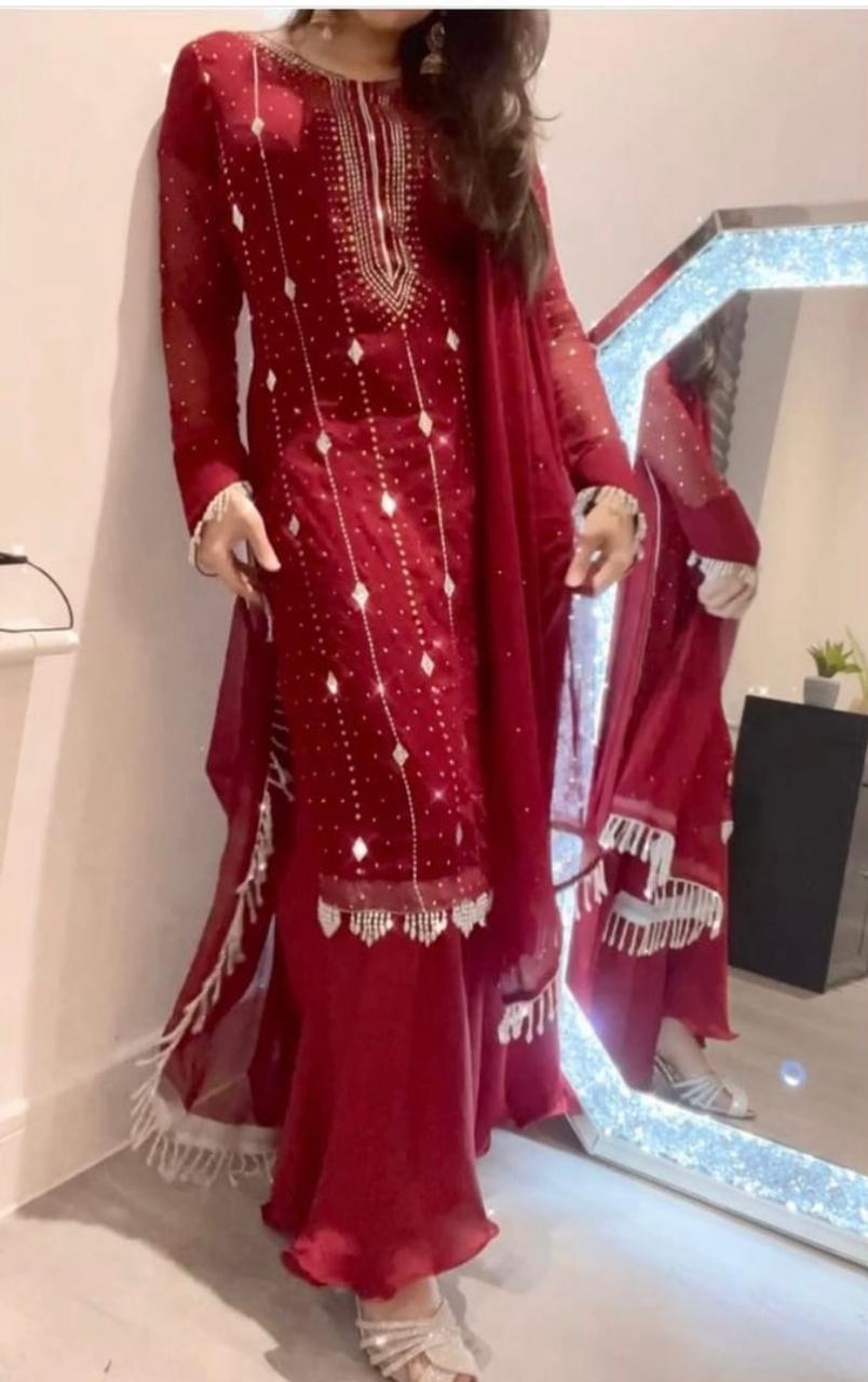 _ALHAMDULILAH_, introducing our stunning 2-piece dress! Made from Soft Bamber Chiffon, the shirt features intricate Mukaish Kamdani work in a beautiful Barfi design, with heavy work on the gala and sleeves. Paired with a gorgeous Bamber Chiffon dupatta adorned with Mukaish Kamdani work, this outfit is a true masterpiece.
