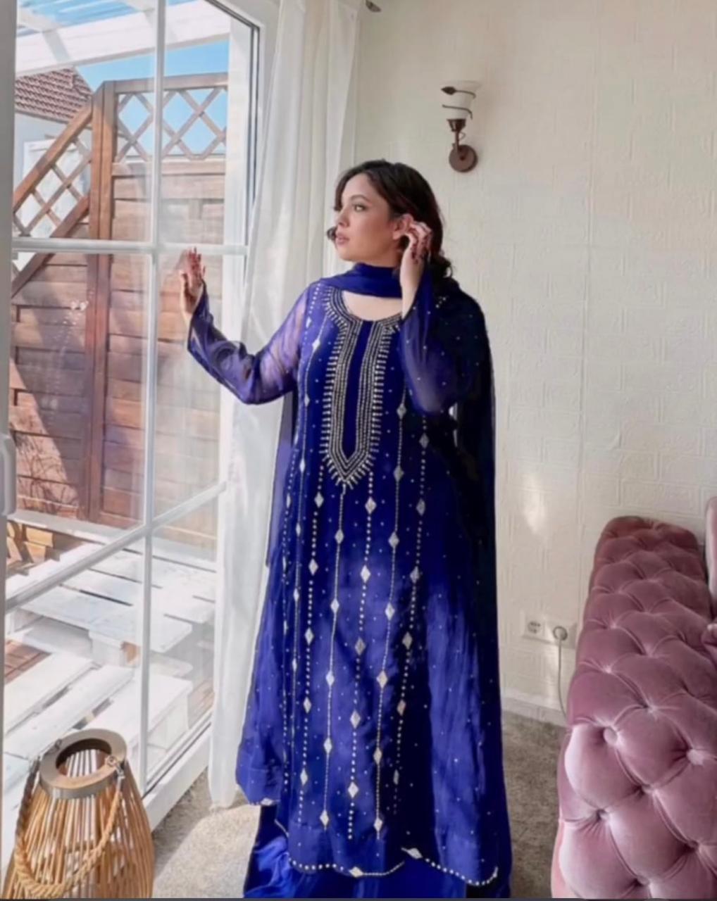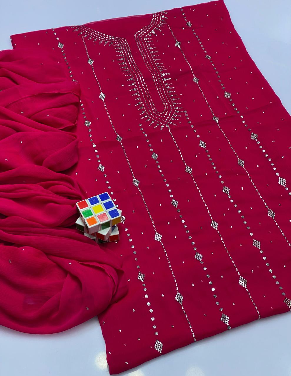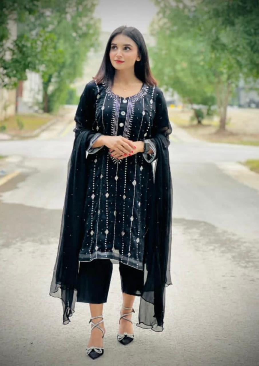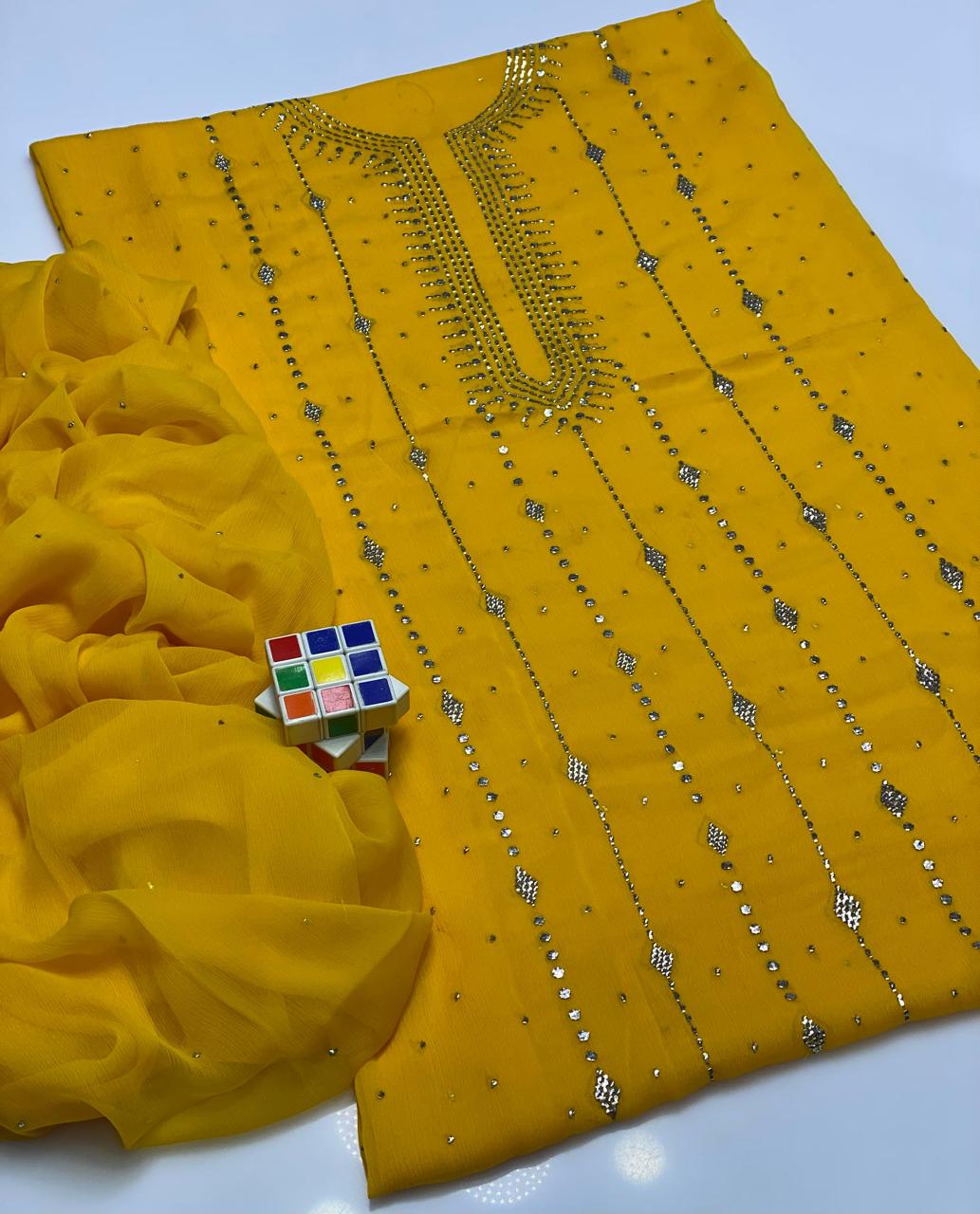 _ALHAMDULILAH_, introducing our stunning 2-piece dress! Made from Soft Bamber Chiffon, the shirt features intricate Mukaish Kamdani work in a beautiful Barfi design, with heavy work on the gala and sleeves. Paired with a gorgeous Bamber Chiffon dupatta adorned with Mukaish Kamdani work, this outfit is a true masterpiece.