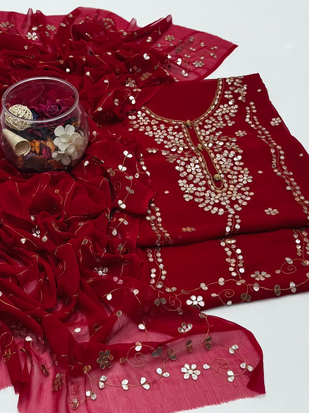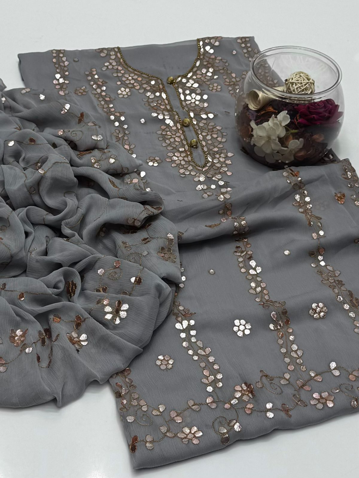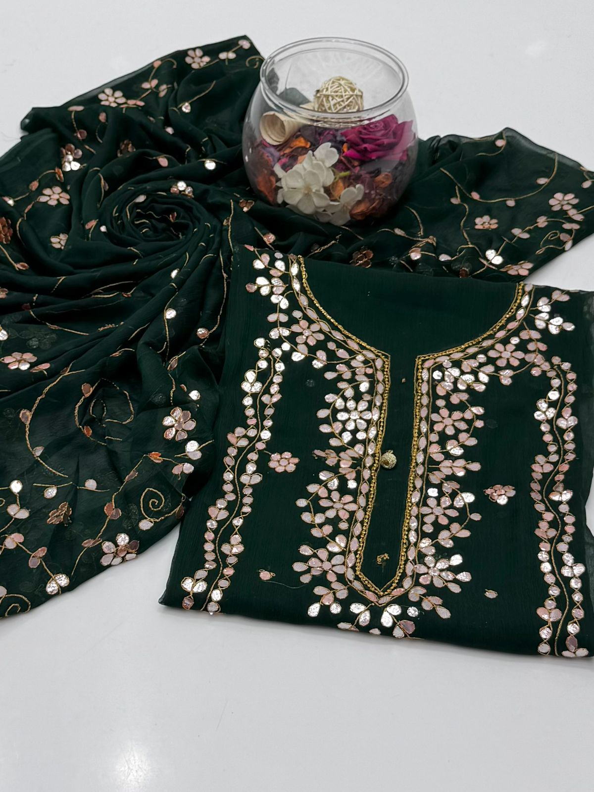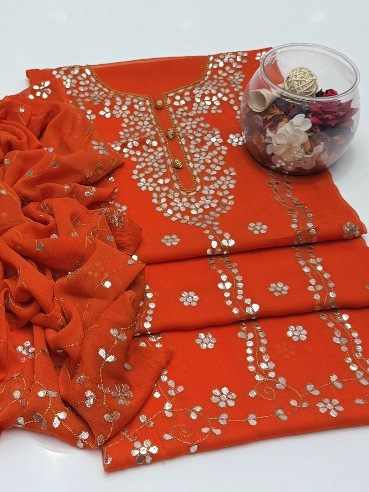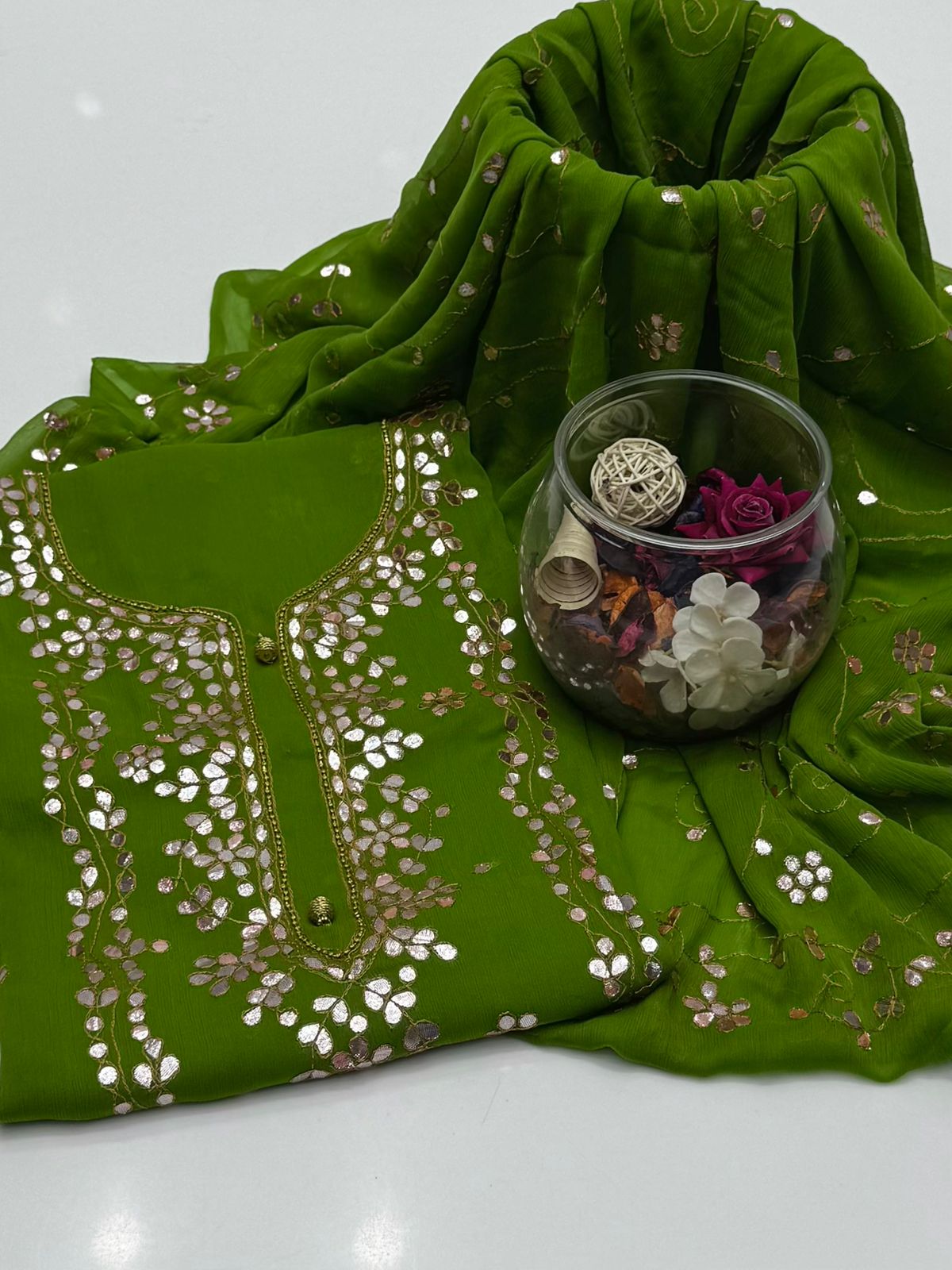 "Exquisite elegance in every detail! This stunning 2-piece suit features a Pure Soft Chiffon shirt with handmade pasting press Gotta work on the gala and daman in a new style. Paired with a breathtaking full jaal dupatta, this outfit is a masterpiece of craftsmanship.