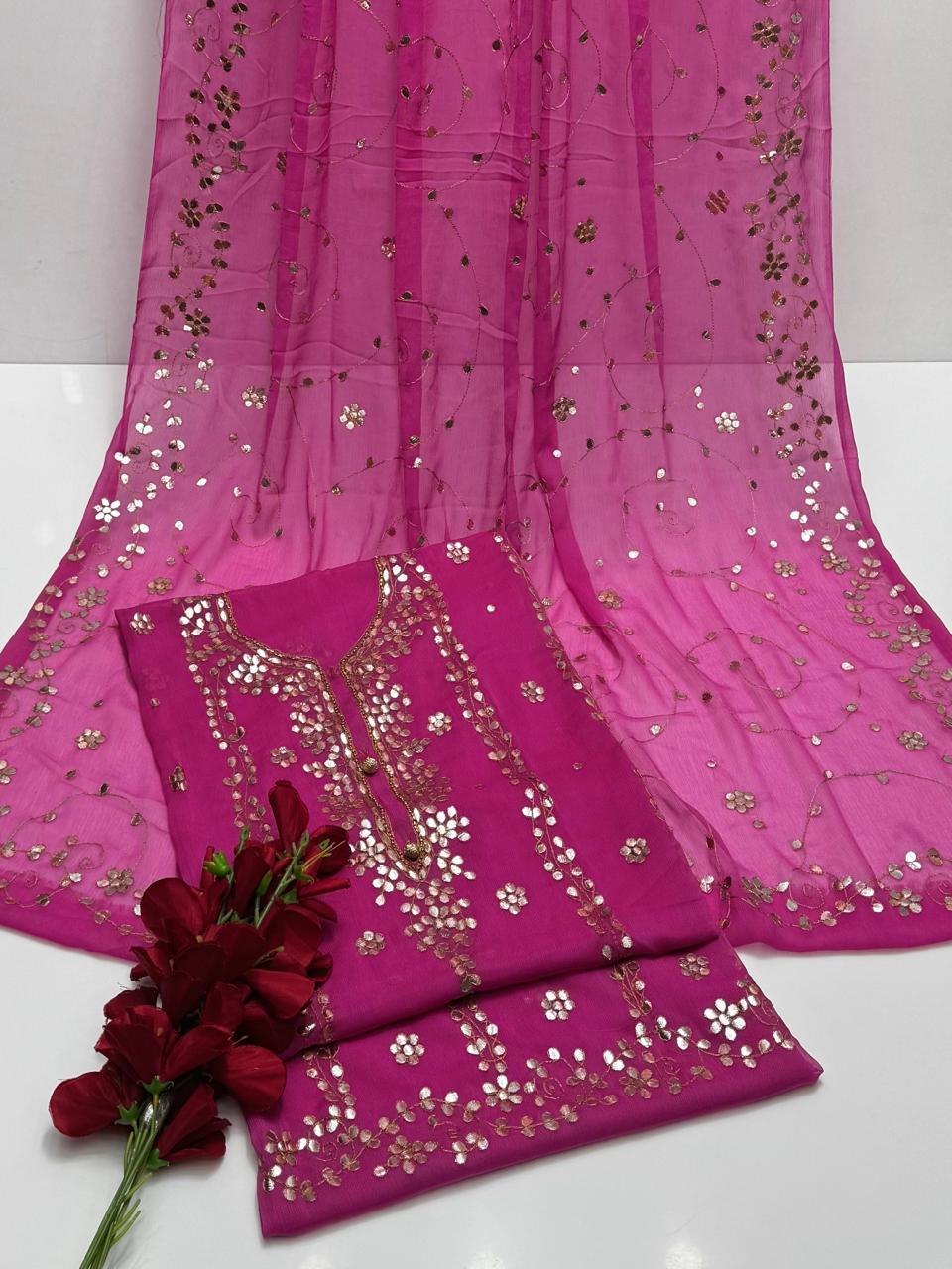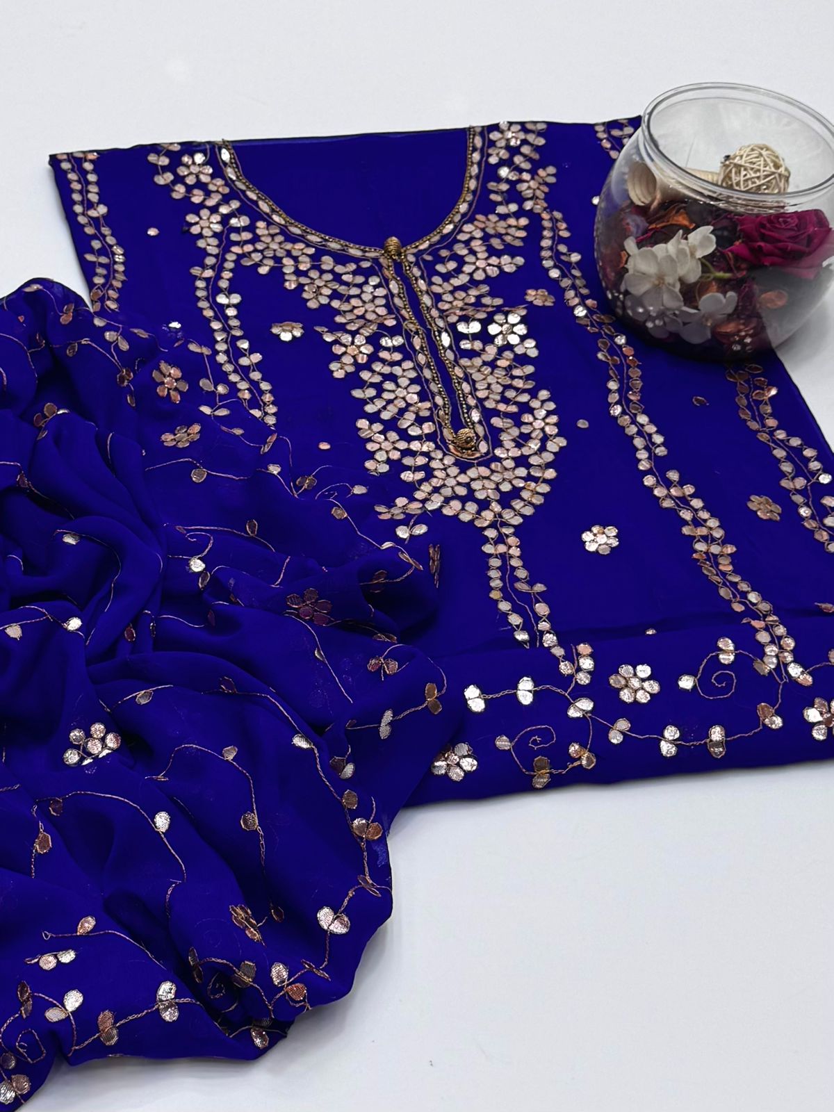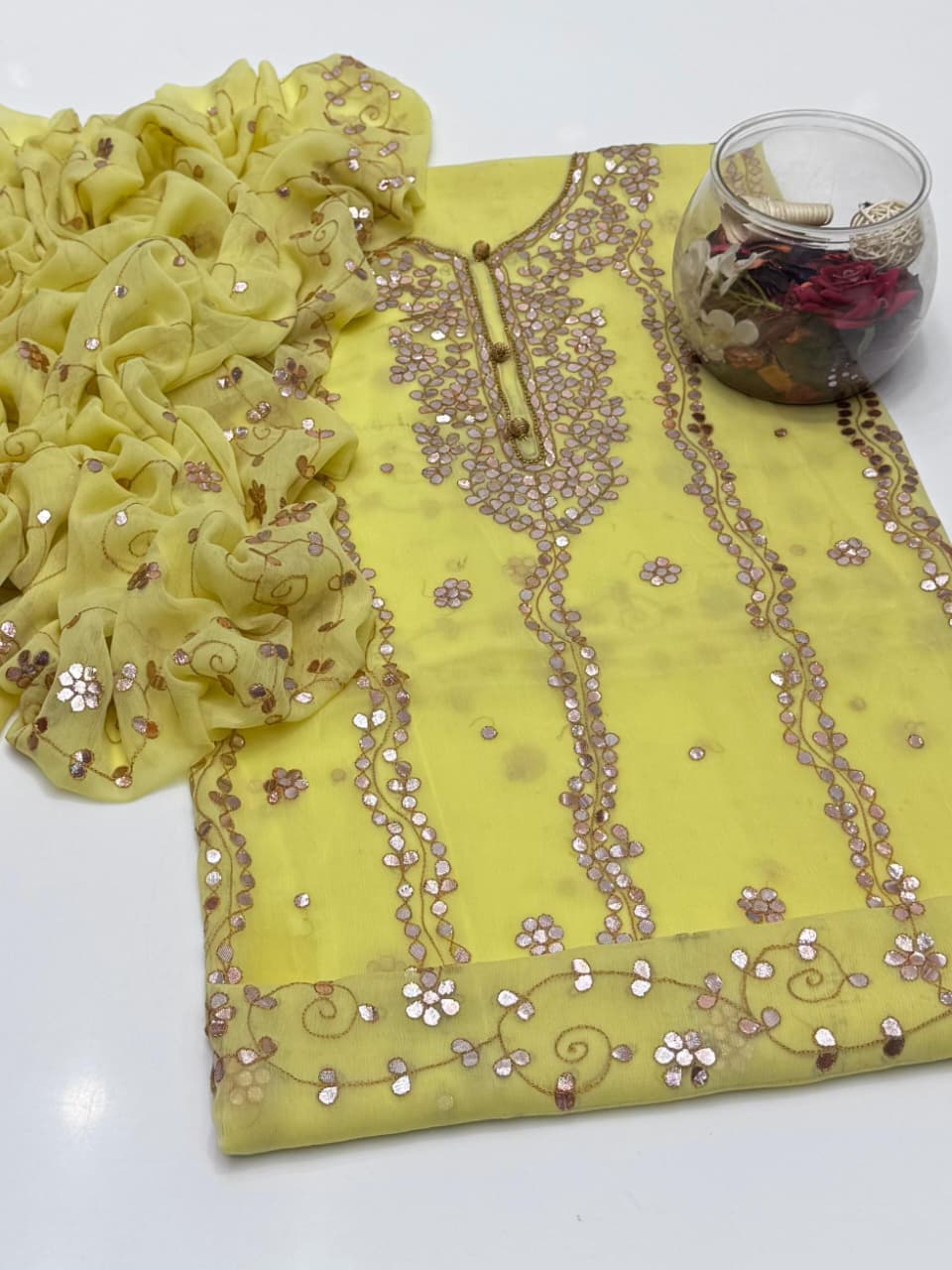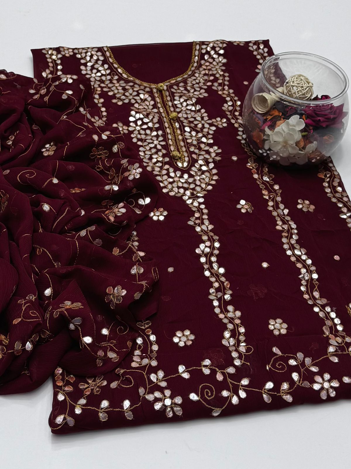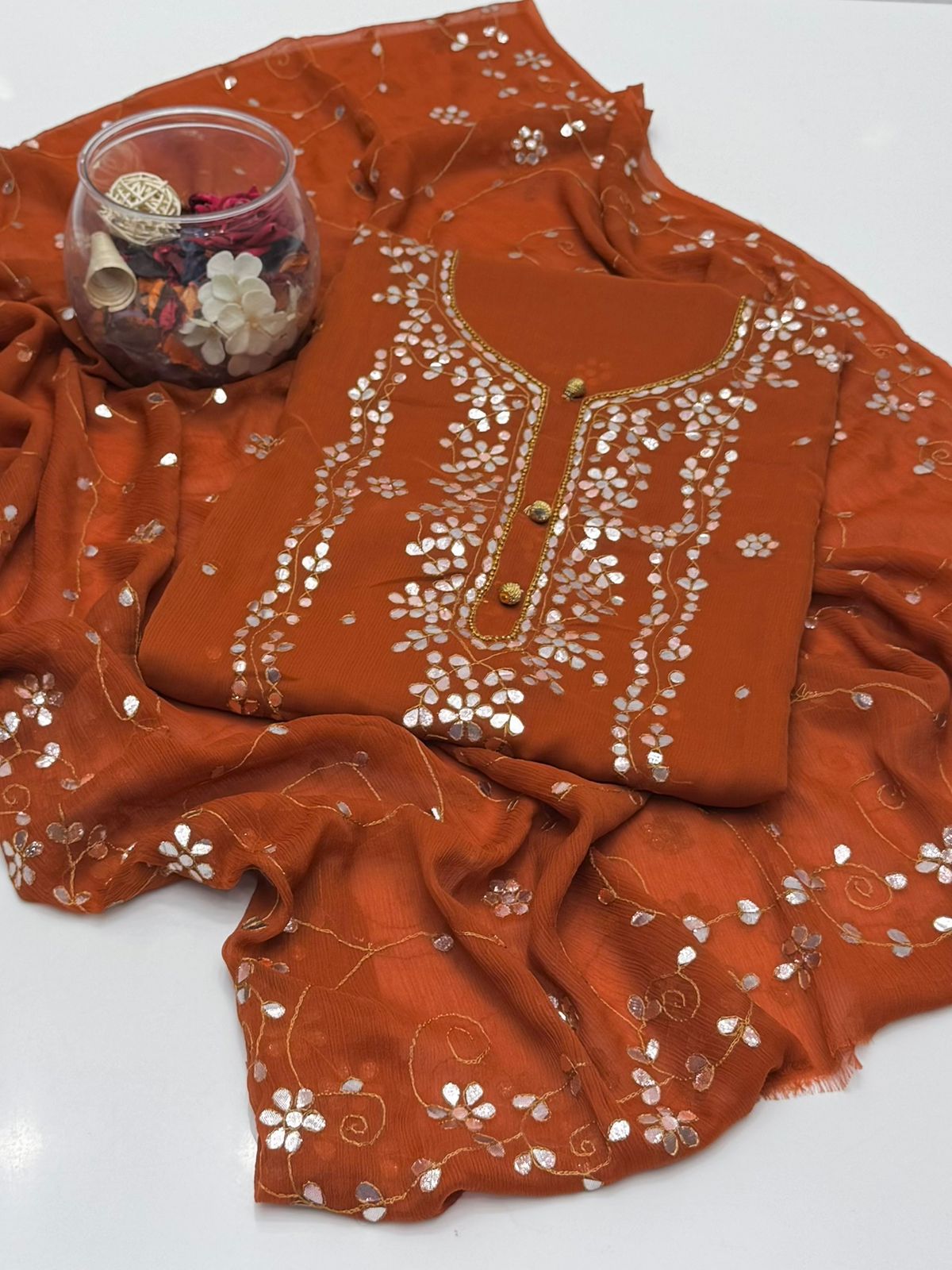 "Exquisite elegance in every detail! This stunning 2-piece suit features a Pure Soft Chiffon shirt with handmade pasting press Gotta work on the gala and daman in a new style. Paired with a breathtaking full jaal dupatta, this outfit is a masterpiece of craftsmanship.