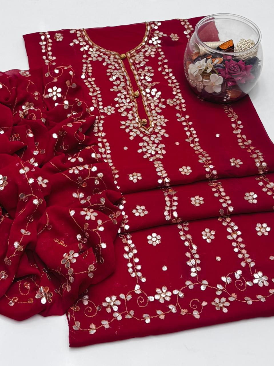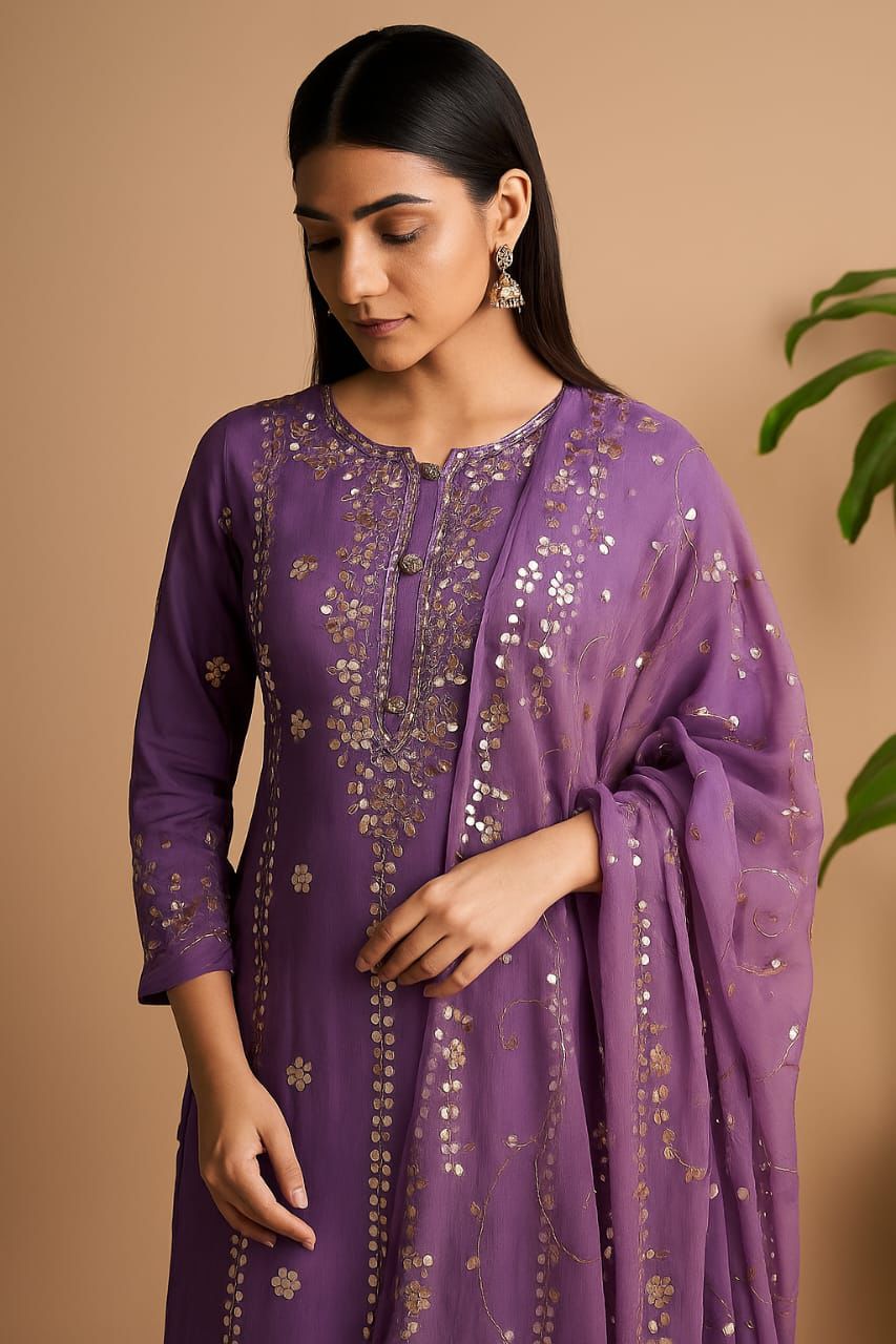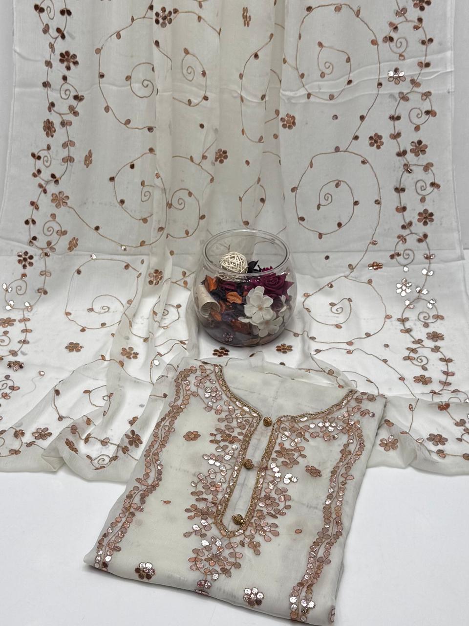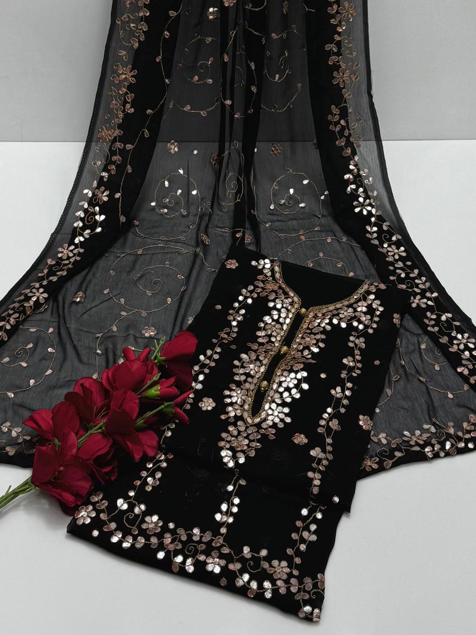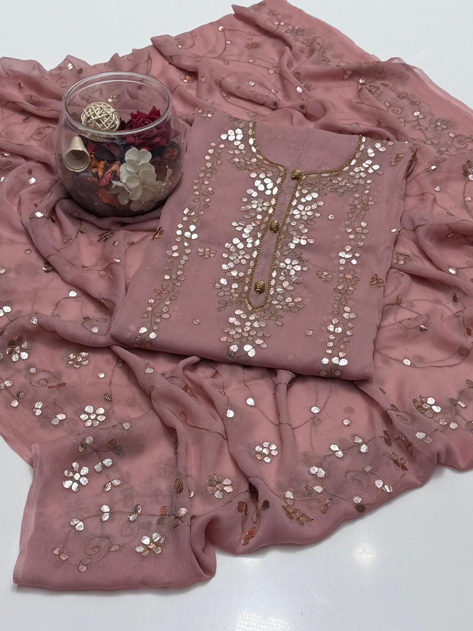 "Exquisite elegance in every detail! This stunning 2-piece suit features a Pure Soft Chiffon shirt with handmade pasting press Gotta work on the gala and daman in a new style. Paired with a breathtaking full jaal dupatta, this outfit is a masterpiece of craftsmanship.