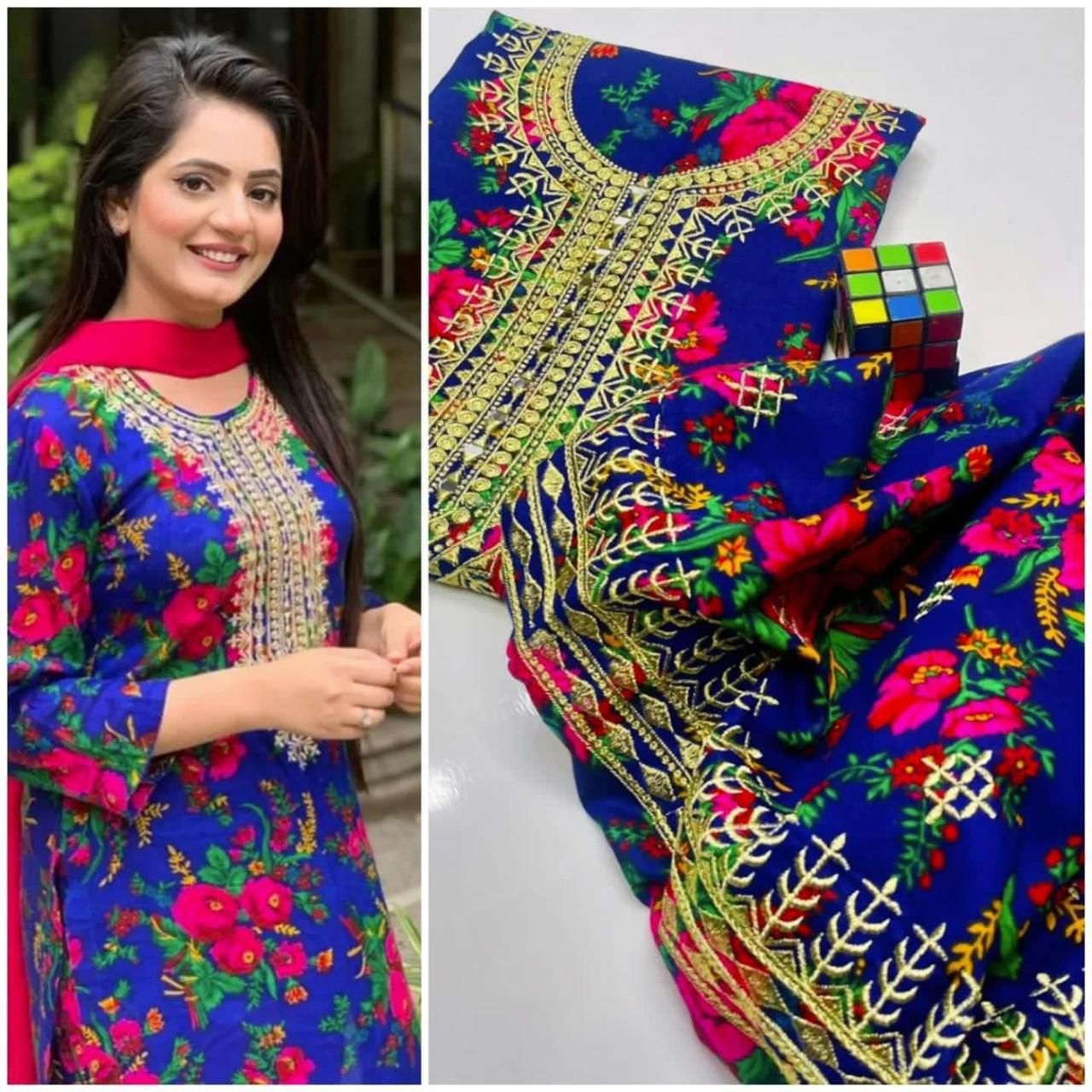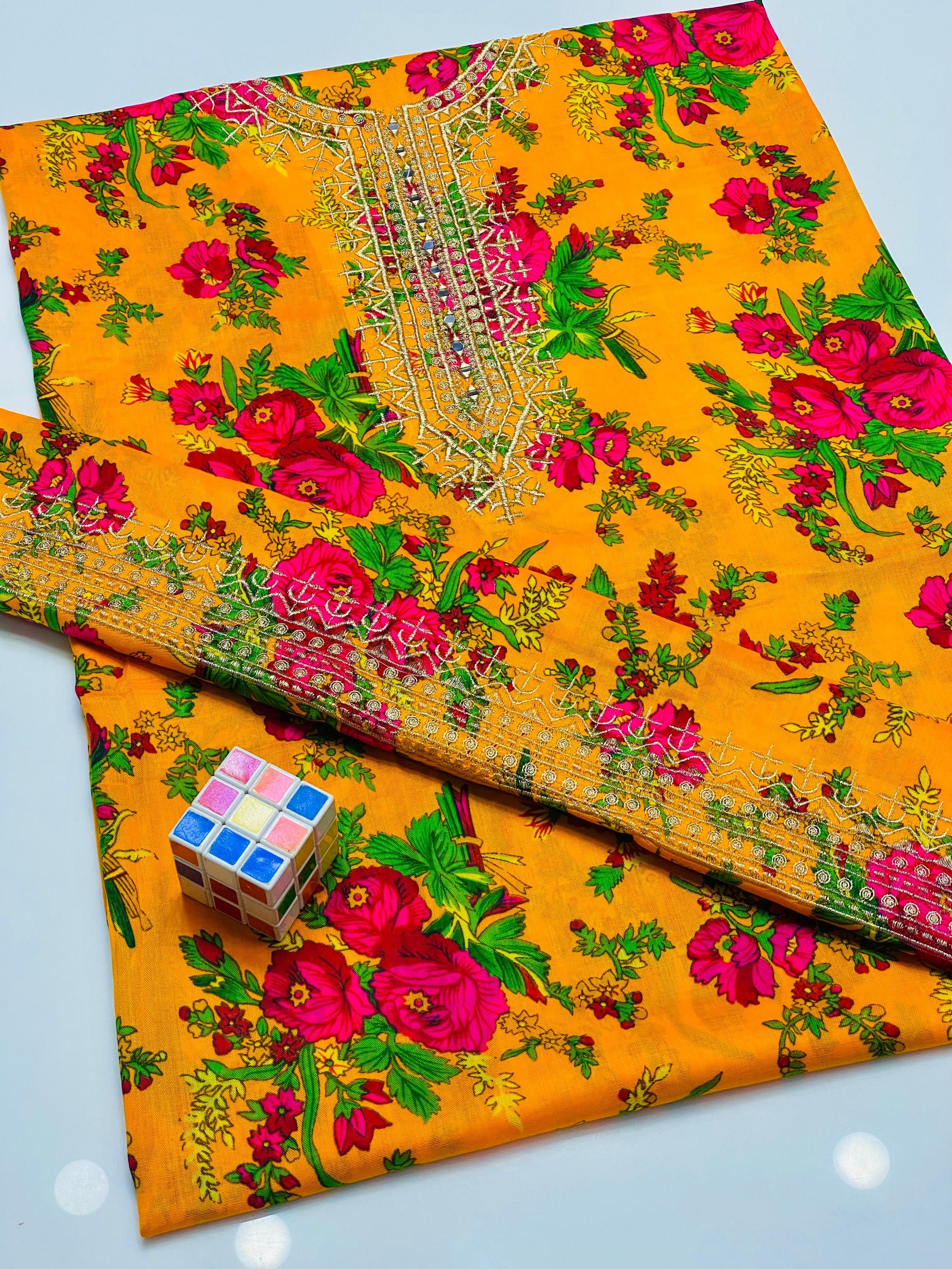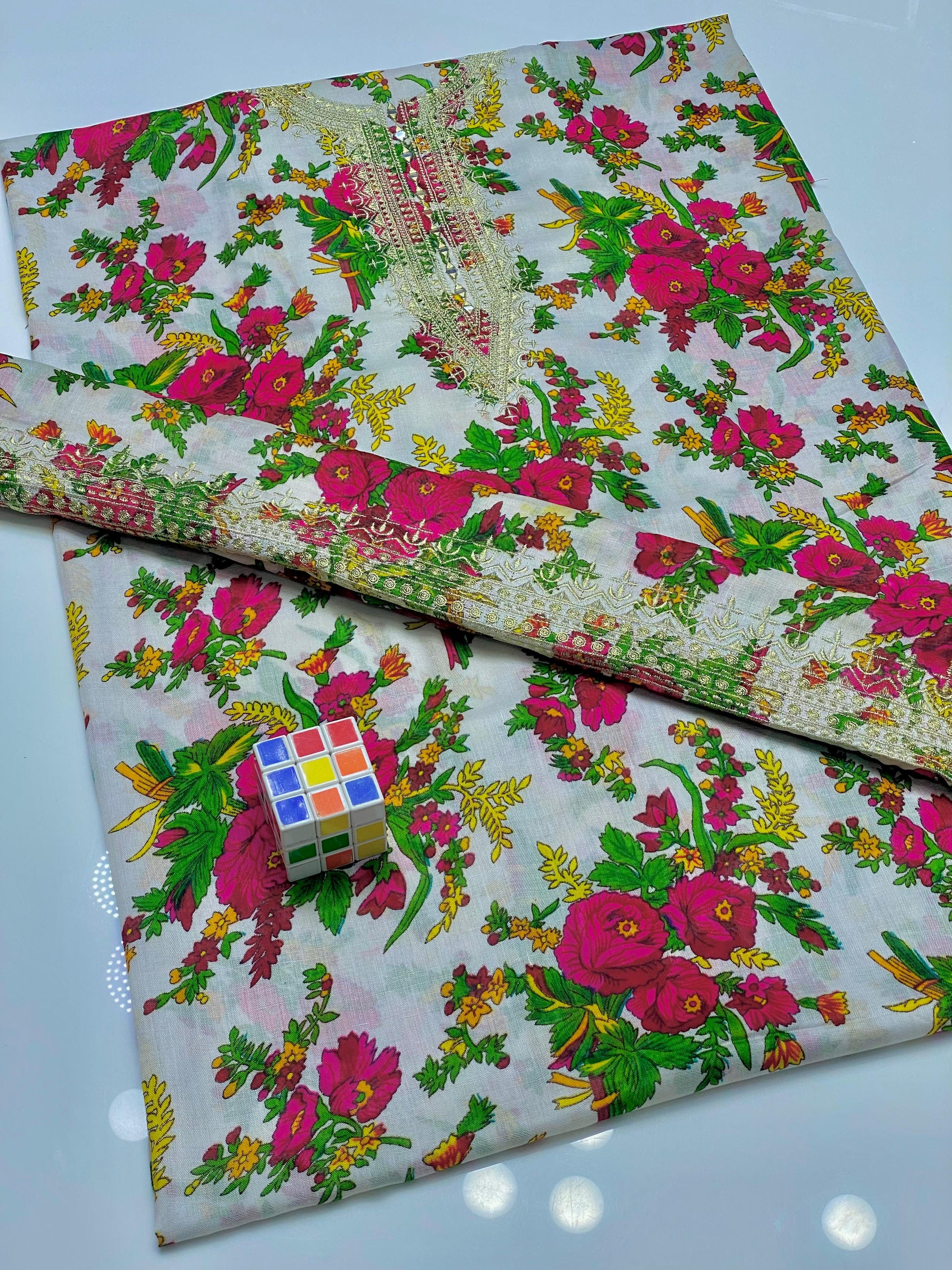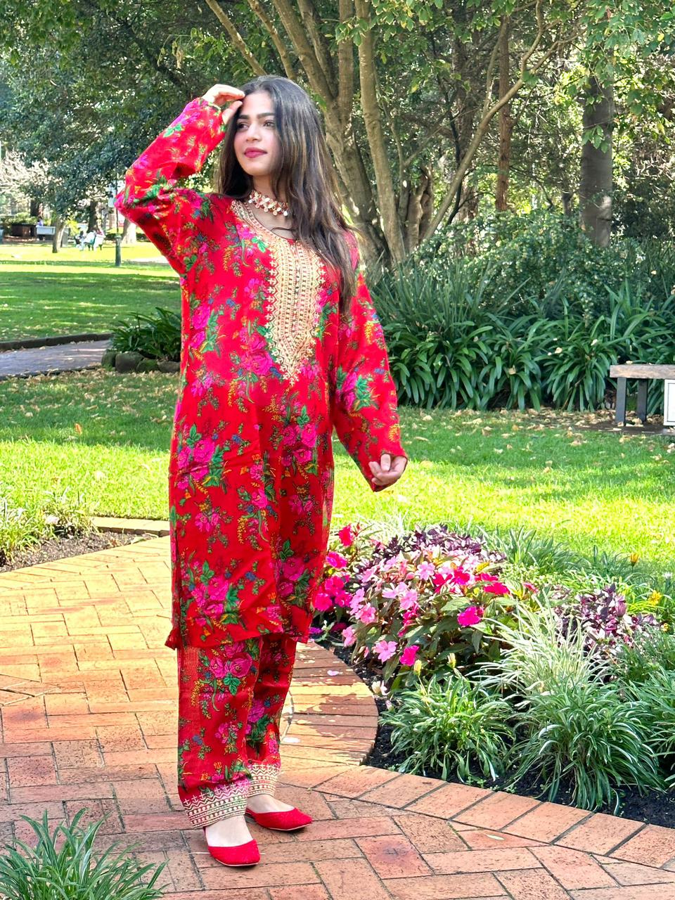 "_ALHAMDULILAH, introducing _Gul Naar's stunning 2-piece collection! Made from premium Swiss Marina fabric, the shirt features intricate Tilla Gala embroidery work paired with digital print on the front, back, and sleeves. The trouser boasts beautiful embroidery work, adding a touch of elegance to this outfit.